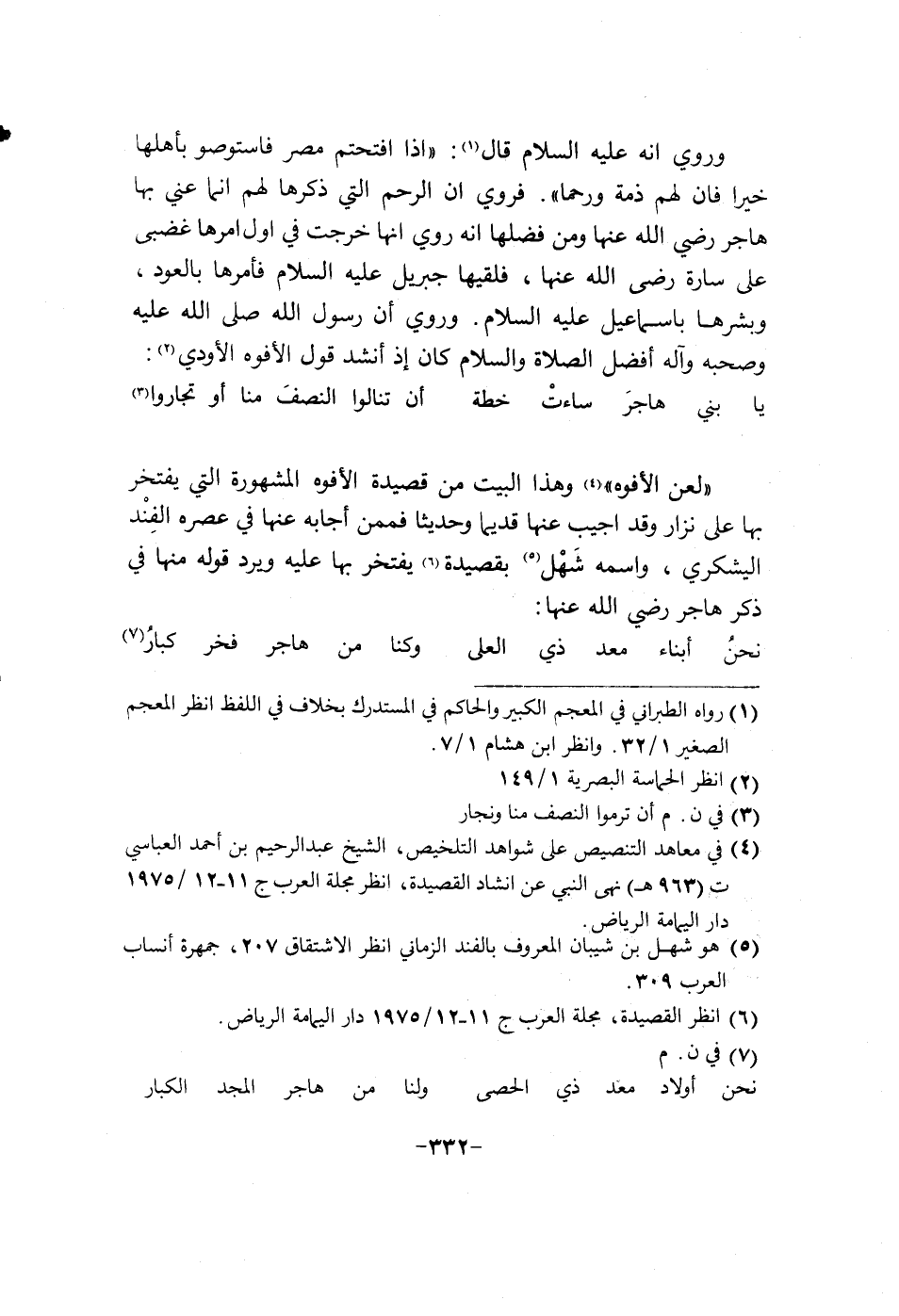 وروي إنه عليه السلام قال: " اذا أقتحمتم مصر فاستوصوا باهلها خيرا فان لهم ذمة ورحما ". فروي إن الرحم التي ذكرها لهم أنما عني بها هاجر رضي الله عنها ومن فضلها إنه روي أنها خرجت في أول أمرها غضبى على سارة رضي الله عنها، فلقيها جبريل عليه السلام فامره بالعود، وبشرها بأسماعيل عليه السلام. وري إن رسول الله (كان أذ أنشد قول الأفوه الأودي: