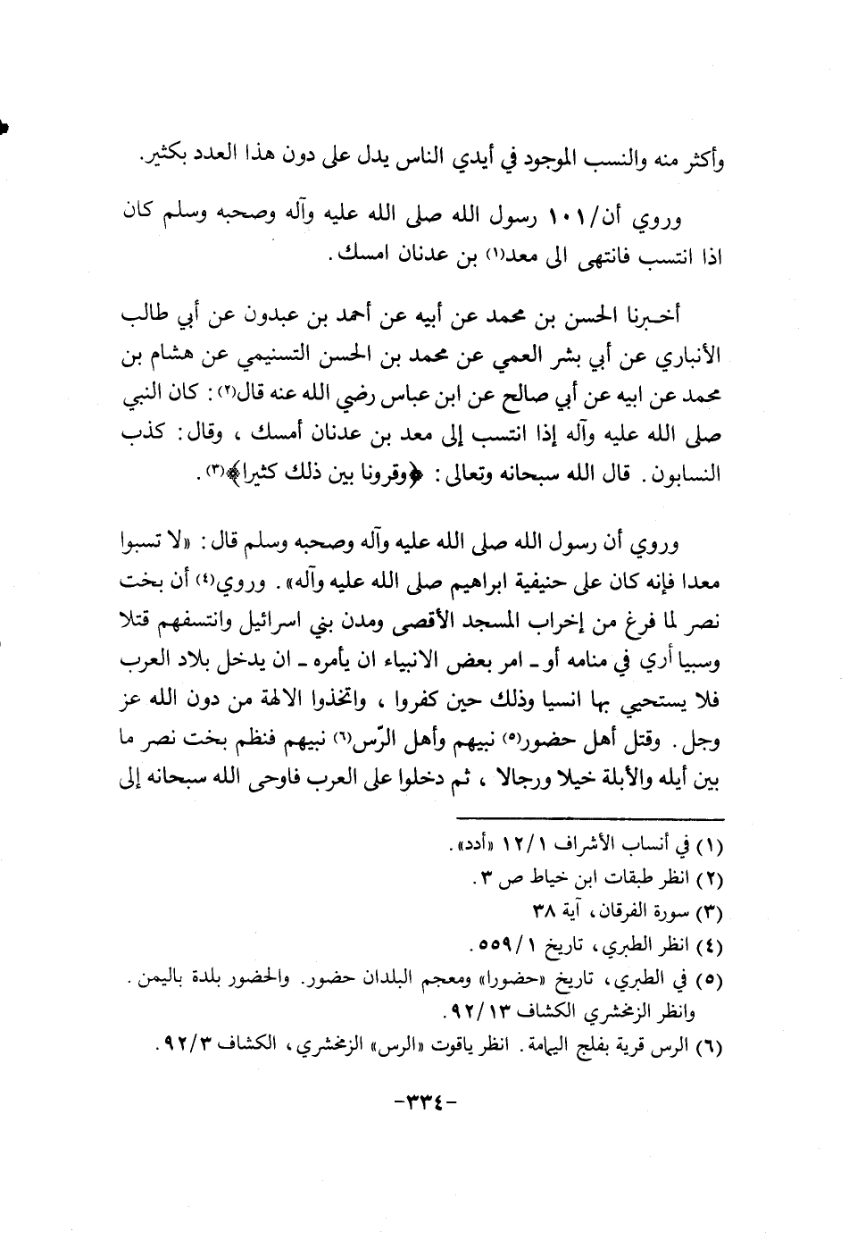 اخبرنا الحسن بن محمد عن أبيه عن محمد بن عبدون عن أبي طالب الانباري عن أبي بشر العمي عن محمد بن الحسين التسميني عن هشام بن محمد عن أبيه عن أبي صالح عن عباس رضي الله عنه قال: كان النبي (إذا أنتسب الى معد بن عدنان أمسك، وقال: كذب الناسبون. قال الله سبحانه وتعالى: (وقرونا بين ذلك كثيرا) .