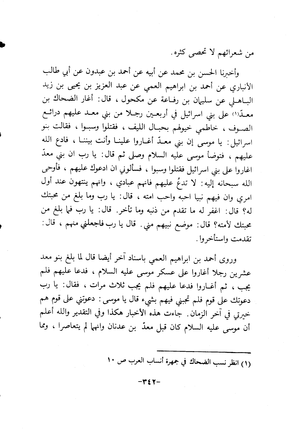 وروى أحمد بن أبراهيم العمي بإسناد أخر أيضاً قال لما بلغ بنو معد عشرين رجلا أغاروا على عسكر موسى عليه السلام، فدعا عليهم فلم يجب، ثم أغاروا فدعا عليهم فلم يجب صلاص مرات، فقال: يا رب دعوتك على قوم فلم تجبني فيهم بشيء قال يا موسى: دعوتني على قوم هم خيرتي في أخر الزمان. جاءت هذه الاخبار هكذا وفي التقدير والله أعلم إن موسى عليه السلام كان قبل معد بن عدنان وأنهما لم يتعاصرا، ومما