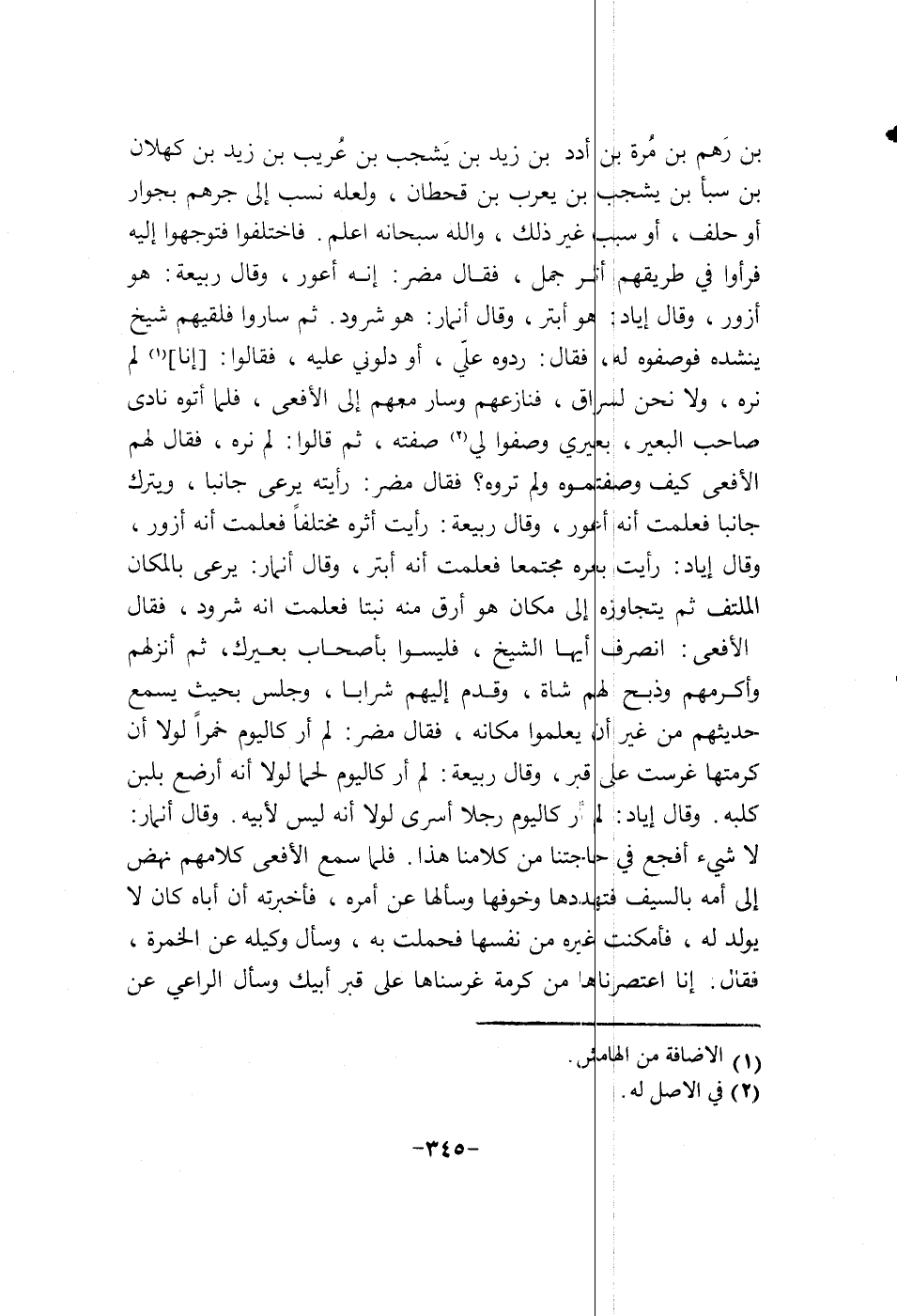 بن رهم بن مرة بن أدد بن زيد بن يشجب بن عريب بن زيد بن كهلان بن سبأ بن يشجب بن يعرب بن قحطان، ولعله نسب الى جرهم بجوار أو حلف، أو سبب غير ذلك، والله سبحانه أعلم. فأختلفوا فتوجهوا اليه فرأوا في طريقهم أثر جمل، فقال مضر: إنه أعور، وقال ربيعة: هو أزور، وقال أياد: هو أبتر، وقال أنمار: هو شرود. ثم ساروا فلقيهم شيخ ينشده فوصفوه له، فقال: ردوه علي، أو دلوني عليه، فقالوا: أنا لم نره، ولا نحن لسراق، فنازعهم وسار معهم الى الافعى، فلما أتوه نادى صاحب البعير، بعيري وصفوا لي صفته، ثم قالوا: لو لم نره، فقال لهم الافعى كيف وصفتموه ولم تروه؟ فقال مضر: رأيته يرعى جانباً، ويترك جانباً فعلمت إنه أعور، وقال ربيعة: رأيت أثره مختلفاً فعلمت إنه أزور، وقال أياد: رأيت بعره مجتمعاً فعلمت إنه أبتر، وقال أنمار: يرعى بالمكان الملتف ثم يتجاوزه الى مكان أرق منه نبتاً فعلمت إنه شرود، فقال الافعى: أنصرف أيها الشيخ، فليسوا بأصحاب بعيرك، ثم أنزلهم وأكرمهم وذبح لهم شاة، وقدم اليهم شراباً، وجلس بحيث يسمع حديثهم من غير إن يعلموا مكانه، فقال مضر: لم أر كاليوم خمراً لولا إن كرمتها غرست على قبر، وقال ربيعة: لم أر كاليوم لحماً لولا إنه أرضع بلبن كلبه. وقال أياد: لم أر كاليوم رجلا أسرى أولا إنه ليس لأبيه. قال أنمار: لا شيء أفجع في حاجتنا من كلامنا هذا. فلما سمع الافعى كلامهم نهض الى أمه بالسيف فتهددها وخوفها وسألها عن أمره، فأخبرته أن أباه كان لا يولد له. فأمكنت غيره من نفسها فحملت به، وسأل وكيله عن الخمرة، فقال. أنا اعتصرناها من كرمة غرسناها على قبر أبيك وسأل الراعي عن