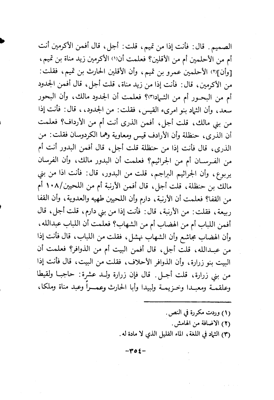 الصميم قال: أذا أنت من تميم قلت أجل قال أفمن الأكرمين أنت أم من الاحلمين أم من الاقلين؟ فعلمت إن الاكرمين زيد مناة بن تميم وإن الاحلمين عمرو بن تميم وإن الاقلين الحارث بن تميم فقلت من الاكرمين قال: فانت أذا من زيد بن مناة قلت أجل قال أفمن الجدود أم من البحور أم من الثماد؟ فعلمت إن الجدود مالك وإن البحور سعد وإن الثمود بنو أمرئ القيس فقلت: من الجدود قال: فانت أذا من بني مالك قات أجل أفمن الذرى أم من الارداف؟ فعلمت إن الذرى حنظلة وإن الارداف قيس ومعاوية وهما الكردوسان فقات: من الذرى قال أذا من حنظلة قات أجل قال أفمن البدور أنت أم من الفرسان أم من الجراثيم؟ فعلمت إن البدور مالك وإن الفرسان يربوع وإن الجراثيم البراجم قلت من البدور قال فانت أذا من بني مالك بن حنظلة قلت أجل قال أفمن الارنبة أم من اللحيين108 أم من القفا؟ فعلمت إن الارنبة دارم وإن اللحيين طهيه والعدوية وإن القفا ربيعة فقلت من الارنبة قال: فانت أذا من بني دارم قلت أجل قال: أفمن اللباب أم من الهضاب أم من الشهاب؟ فعلمت إن اللباب عبد الله وإن الهضاب مجاشع وإن الشهاب نهشل فقلت من اللباب قال فانت أذا من عبد الله قلت أجل قال أفمن البيت أم من الذوافر؟ فعلمت إن البيت بنو زرارة وإن الذوافر الاحلاف فقلت من البيت قال فانت أذا من بني زرارة قلت أجل قال فان زرارة ولد عشرة: حاجبا ولقيطا وعلقمة ومعبدا وخزيمة ولبيدا وأبا الحارث وعمرا وعبد مناة وملكا