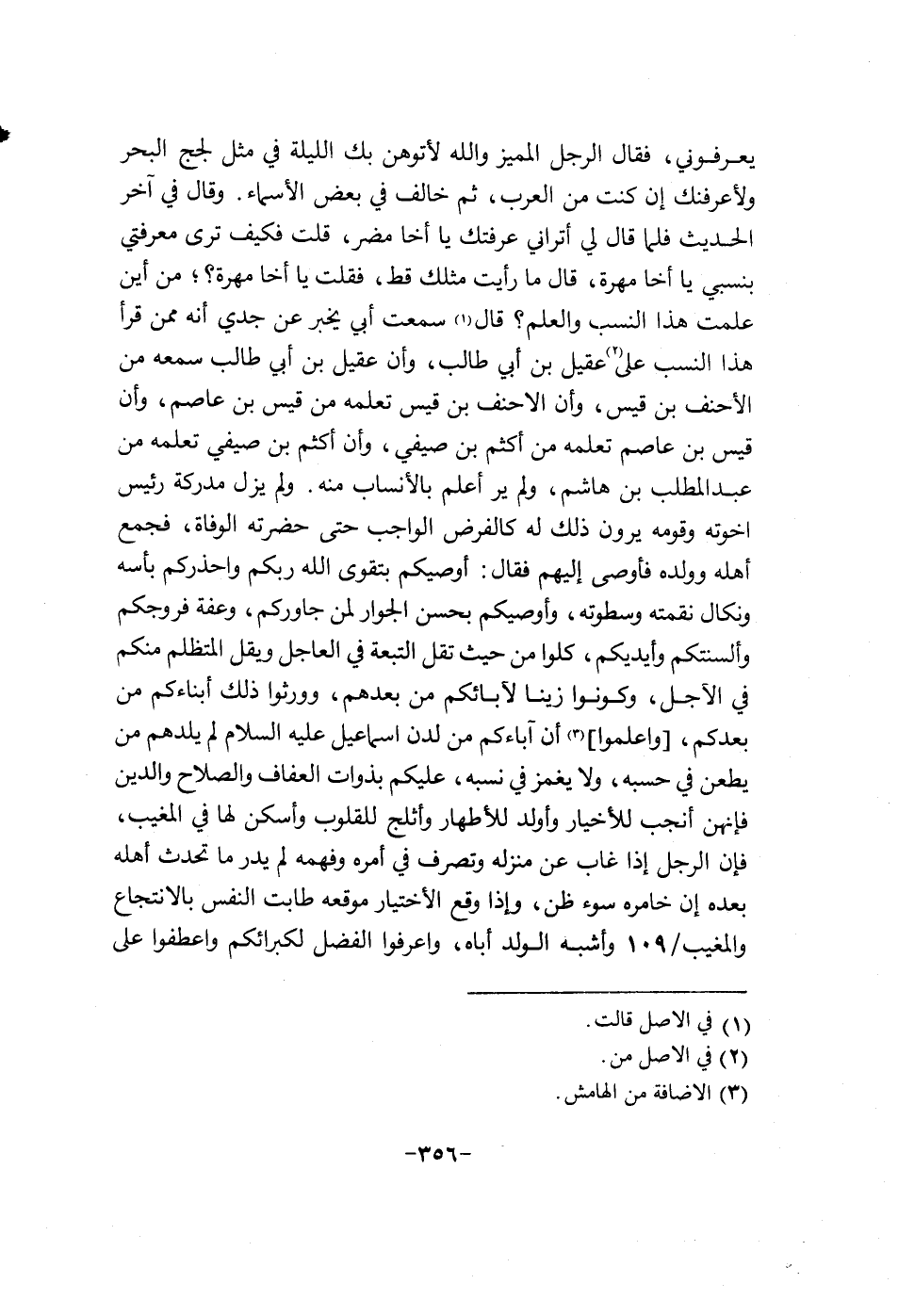 يعرفوني الرجل المميز والله لاتوهن بك الليلة في مثل لجج البحر ولاعرفنك إن كنت من العرب ثم خالف في بعض الاسماء. وقال في أخر الحديث فلما قال لي أتراني عرفتك يا أخا مضر قلت كيف ترى معرفتي بنسبي يا أخا مهرة قال: ما رأيت مثلك قط فقلت يا أخا مهرة؟ من أين علمت هذا النسب والعلم؟ قال سمعت أبي يخبر عن جدي إنه ممن قرأ هذا النسب على عقيل بن أبي طالب وإن عقيل بن أبي طالب سمعه من الاحنف بن قيس وإن الاحنف بن قيس تعلمه من قيس بن عاصم وإن قيس بن عاصم تعلمه من أكثم بن صيفي وإن أكثم بن صيفي تعلمه من عبد المطلب بن هاشم ولم ير أعلم بالنساب منه. ولم يزل مدركة رئيس أخوته وقومه يرون ذلك له كالفرض الواجب حتى حضرته الوفاة فجمع أهلله وولده فاوصى اليهم فقال: أوصيكم بتقوى الله ربكم وأحذركم باسمه ونكال نقمته وسطوته وأوصيكم بحسن الجوار لمن جاوركم وعفة فروجكم والسنتكم وأيديكم كلوا من حيث تقل التبعة في العاجل ويقل المتظلم منكم في الاجل وكونوا زينا لابائكم من بعدهم وورثوا ذلك أبناء كممن بعدكم وأعلموا إن أباءكم من لدن أسماعيل عليه السلام لم يدلهم من يطعن في حسبه ولا يغمز في نسبه عليكم بذروات العفاف والصلاح والدين فانهن أنجب للاخيار وأولد للاطهار وأثلج للقلوب وأسكن لها في المغيب فان الرجل أذا غاب عن منزله وتصرف في أمره وفهمه لم يدر ما تحدث أهله بعده إن خامره سوء ظن وأذا وقع الاختيار موقعه طابت النفس بالانتجاع والمغيب109 وأشبه الولد أباه وأعرفو الفضل لكبرائكم وأعطفوا على