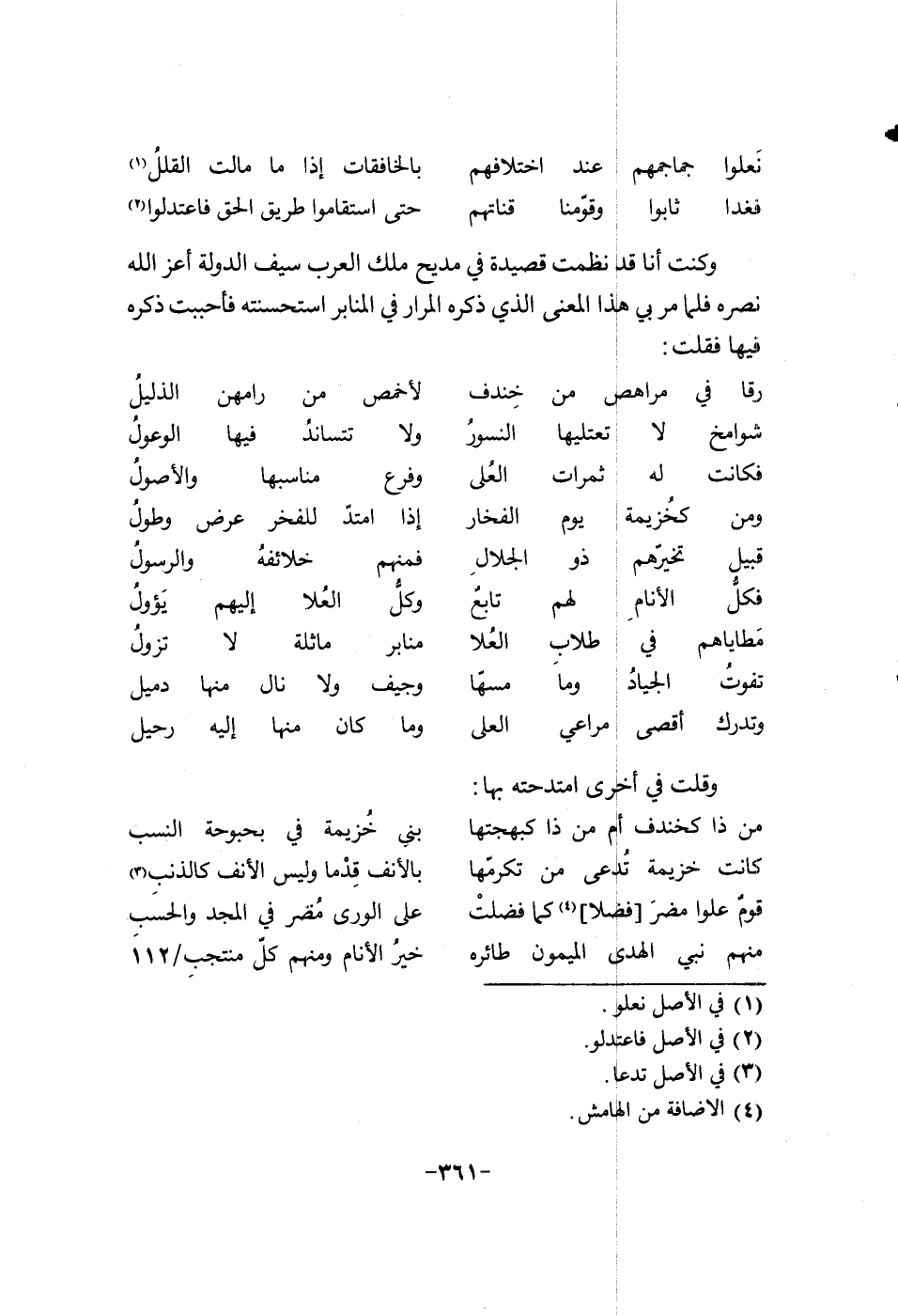 وكنت أنا قد نظمت قصيدة في مديح ملك العرب سيف الدولة أعز الله نصره فلما مر بي هذا المعنى الذي ذكره المرار في المنابر أستحسنته فاحببت ذكره فيها فقال: