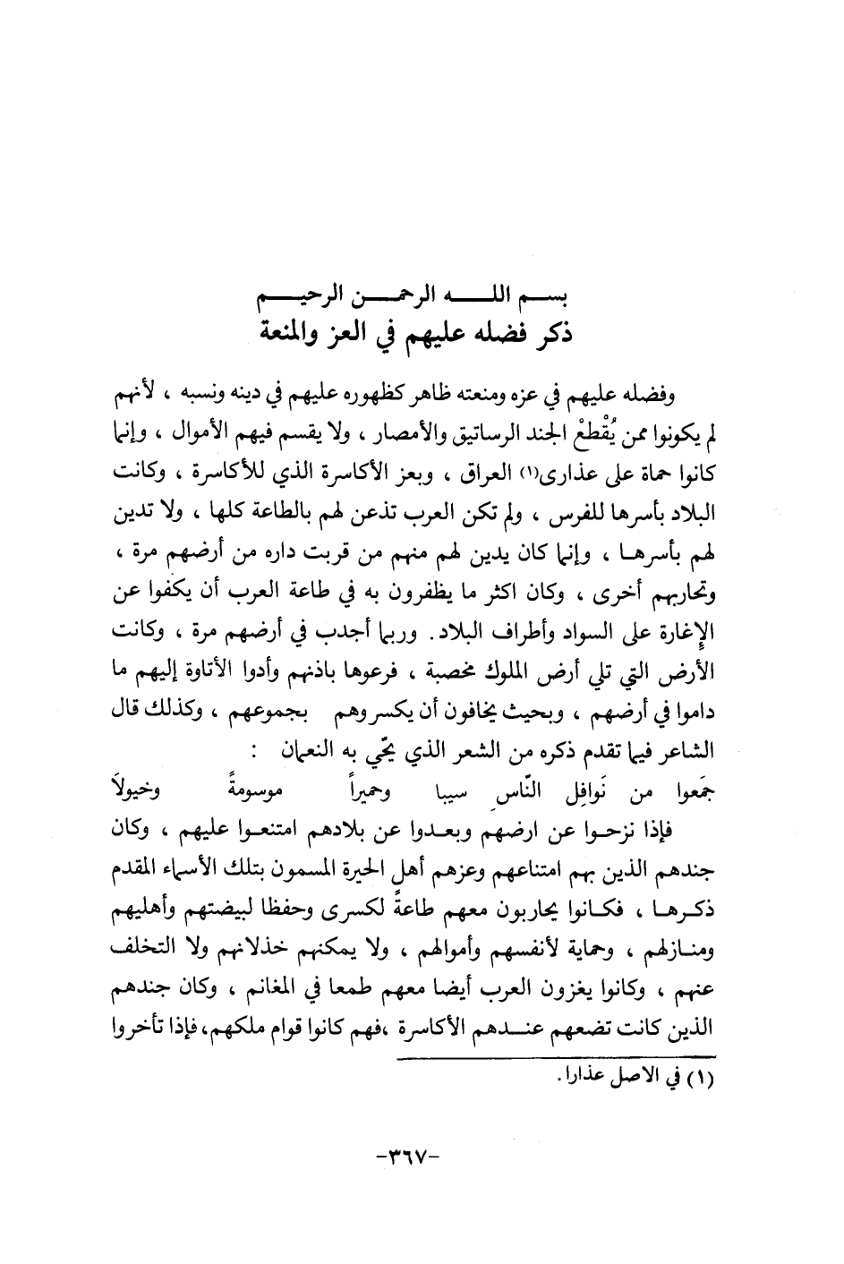 وفضله عليهم في عزه ومنعته ظاهر كظهورهم عليهم في دينه ونسبه لانهم لم كونوا ممن يقطع الجند الرساتين والامصار ولا يقسم فيهم الاموال وإنما كانوا حماة على عذارى العراق ونعز الاكاسرة الذي للاكاسرة وكانت البلاد باسرها للفرس ولم تكن العرب تذعن لهم بالطاعة كلها ولا تدين لهم باسرها وإنما كان يدين لهم منهم من قربت داره من أرضهم مرة وتحاربهم أخرى وكان أكثر ما يظفرون به في طاعة العرب إن يكفوا عن الاغارة على السواد وأطراف البلاد. وربما أجدب في أرضهم مرة وكانت الأرض التي تلي أرض الملوك مخصبة فرعوها باذنهم وأدوا الاتاوة اليهم ما داموا في أرضهم وبحيث يخافون إن يكسروهم بجموعهم وكذلك قال الشاعر فيما تقدم ذكره من الشعر الذي يحي به النعمان: