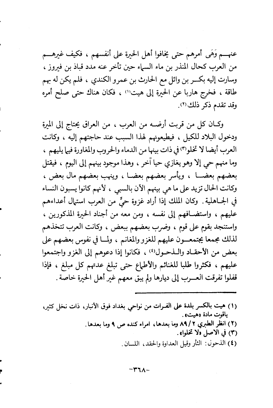 وكان كل من قربت أرضه من العرب من العراق يحتاج إلى الميرة ودخول البلاد للكيل فيطيعونهم لهذا السبب عند حاجتهم إليه م كانت العرب أيضاً لا تخلو في ذات بينها من الدماء والحروب والمغاورة فيما يليهم وما منهم حي إلا يغازي حيا أخر وهذا موجود بينهم إلى اليوم فيقتل بعضهم بعضا وينهب بعضهم مال بعض وكانت الحل تزيد على ما هي بينهم ألان بالسبي لأنهم كانوا يسبون النساء في الجاهلية وكان الملك إذا أراد غزوة حي من العرب أستمال أعدائهم عليهم واستضافهم إلى نفسه ومن معه من أجناد الحيرة المذكورين وأستنجد بقوم على قوم وضرب بعضهم ببعض وكانت العرب تتخذهم لذلك مجمعا يجتمعون عليهم للغزو والمغانم ولما في نفوس بعضهم على بعض من الأحقاد والذحول فكانوا إذا دعوهم إلى الغزو واجتمعوا عليهم فكثروا طلبا للغنائم والأطماع حتى تبلغ عدتهم كل مبلغ فإذا قفلوا تفرقت العرب إلى ديارهم ولم يبق معهم غير أهل الحيرة خاصة.