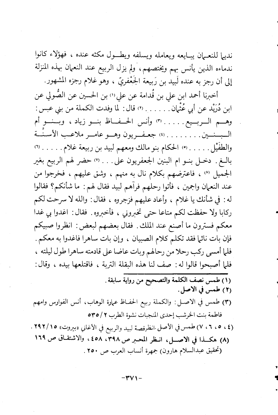 نديما للنعمان يبايعه ويعامله ويسلفه ويطول مكثه عنده، فهؤلاء كانوا ندماءه الذين يأنس بهم ويختصهم، ولم يزل الربيع عند النعمان بهذه المنزلة الى أن رجز به عنده لبيد بن أبي ربيعة الجعفري، وهو غلام رجزه المشهور. أخبرنا أحمد أبن علي قدامة عن علي بن الحسين عن الصولي عن أبن دريد عن أبي عثمان 0000 قال: لما وفد الكلمة من بني عبس: وهم الربيع0000 وأنس الحفاظ بنو زياد، وبنو أم البنين 00000 جعفريون وهو عامر ملاعب الأسنة والطفيل 0000 الحكام بنو مالك ومعهم لبيد بن ربيعة غلام 00000بالغ. دخل بنو أم البنين الجعفريون على 000 حضر لهم الربيع بغير الجميل، فاعترضهم بكلام نال به منهم، وشق عليهم، فخرجوا من عند عثمان وجمين. فأتوا رحلهم فرآهم لبيد فقال لهم: ما شأنكم؟ فقالوا له: في شأنك يا غلام، وأعاد عليهم فزجروه، فقال: والله لا سرحت لكم ركابا ولا حفظت لكم متاعا حتى تخبروني، فأخبروه. فقال. اغدوا بي غدا معكم فتسرون ما أصنع عند الملك. فقال بعضهم لبعض: انظروا صبيكم فان بات نائما فقد تكلم الصبيان، وإن بات ساهرا فاغدوا به معكم. فلما أمسى ركب رحلا من رحالهم وبات عاضا على قادمته ساهرا طول ليلته، فلما أصبحوا قالوا له: صف لنا هذه البقلة التربة، فاقتلعتها بيده، وقال: