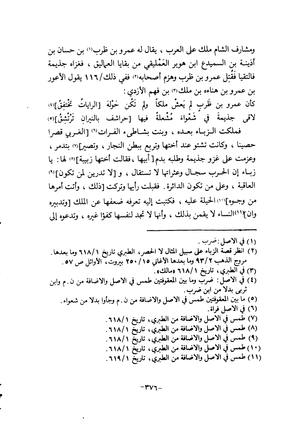 ومشارف الشام ملك على العرب يقال له عمرو بن ظرب بن حسان بن أذينة بت السميدع أبن هوبر العمليقي من بقايا العماليق فغزاه جذيمة فالتقيا فقتل عمرو بن ظرب وهزم أصحابه ففي ذلك 116 يقول الاعور بن عمرو بن هناءه بن مالك بن فهم الازدي: