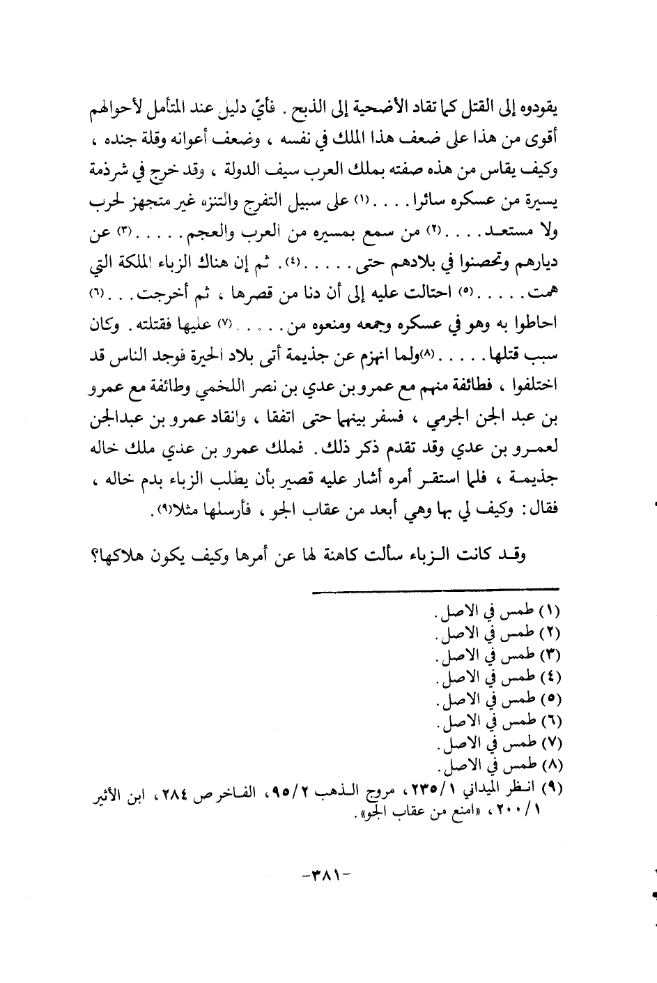 يقود الى القتل كما تقاد الاضحية الى الذبح. فأي دليل عند المتأمل لأحوالهم أقوى من هذا على ضعف هذا الملك في نفسه وضعف أعوانه وقلة جنده وكيف يقاس من هذه صفته بملك العرب سيف الدولة وقد خرج في شرذمة يسير من عسكره سائرا 0000 على سبيل التفرج والتنزه غير متجهز لحرب ولا مستعد 0000 من سمع بمسيره من العرب والعجم000000 عن ديارهم وتحصنهم في بلادهم حتى0000. ثم إن هناك الزباء الملكة التي همت0000 احتالت عليه إلى إن دنا من قصرها ثم أخرجت0000 أحاطوا به وهو في عسكره وجمعه ومنعوه من0000000 عليها فقتلته. وكان سبب قتلها0000 ولما أنهزم عن جذيمة أتى بلاد الحيرة فوجد الناس قد اختلفوا فطائفة منهم مع عمرو بن عدي بن نصر اللخمي وطائفة مع عمرو بن عبد الجن الجرمي فسفر بينهما حتى اتفقا وأنقاد عمرو بن عبد الجن لعمرو بن عدي ملك خاله جذيمة فلما أستقر أمره أشار عليه قصير بان يطلب الزباء بدم خاله فقال: وكيف لي بها وهي أبعد من عقاب الجو فذهبت مثلا.