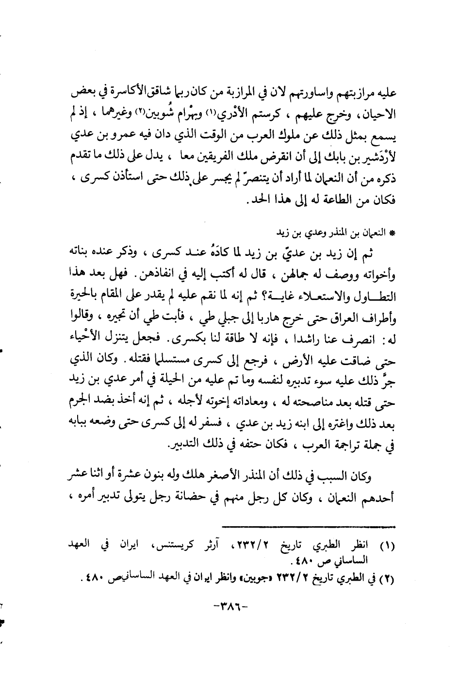 عليه مرازبنتهم وأساورتهم لان في المرازبة من كان ربما شاقق الاكاسرة في بعض الأحيان، وخرج عليهم، كرستم الادري وبهرام شيوبين وغيرهما، إذ لم يسمع بمثل ذلك عن ملوك العرب من الوقت الذي دان في عمرو بن عدي لاردشير بن بابك إلى إن أنقرض ملك الفريقين معا، يدل على ذلك ما تقدم ذكره من إن النعمان لما أراد إن ينتصر لم يجسر على ذلك حتى أستأذن كسرى، فكان من الطاعة له إلى هذا الحد.