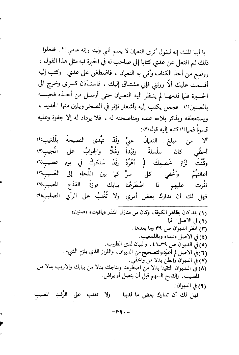 يا أيها الملك إنه ليقول أترى النعمان لا يعلم أنني وليته وإنه عاملي!؟. ففعلوا ذلك ثم أفتعل عن عدي كتاباً إلى صاحب له في الحيره فيه مثل هذا القول، ووضع من أخذ الكتاب وأتى به النعمان، فأضطغن على عدي. على عدي. وكتب إليه أقسمت عليك إلا زرتني فاني مشتاق اليك، فأستأذن كسرى وخرج إلى الحيرة، فلما قدمها لم ينظر إليه النعمان حتى أرسل من أخذه فحبسه بالصنين. فجعل يكتب إليه بأشعار توثر في الصخر ويلين منها الحديد، ويستعطفه ويذكر بلاءه عنده ومناصحته له، فلا يزداد إلا جفوة وعليه قسوة فما كتب إليه قوله: