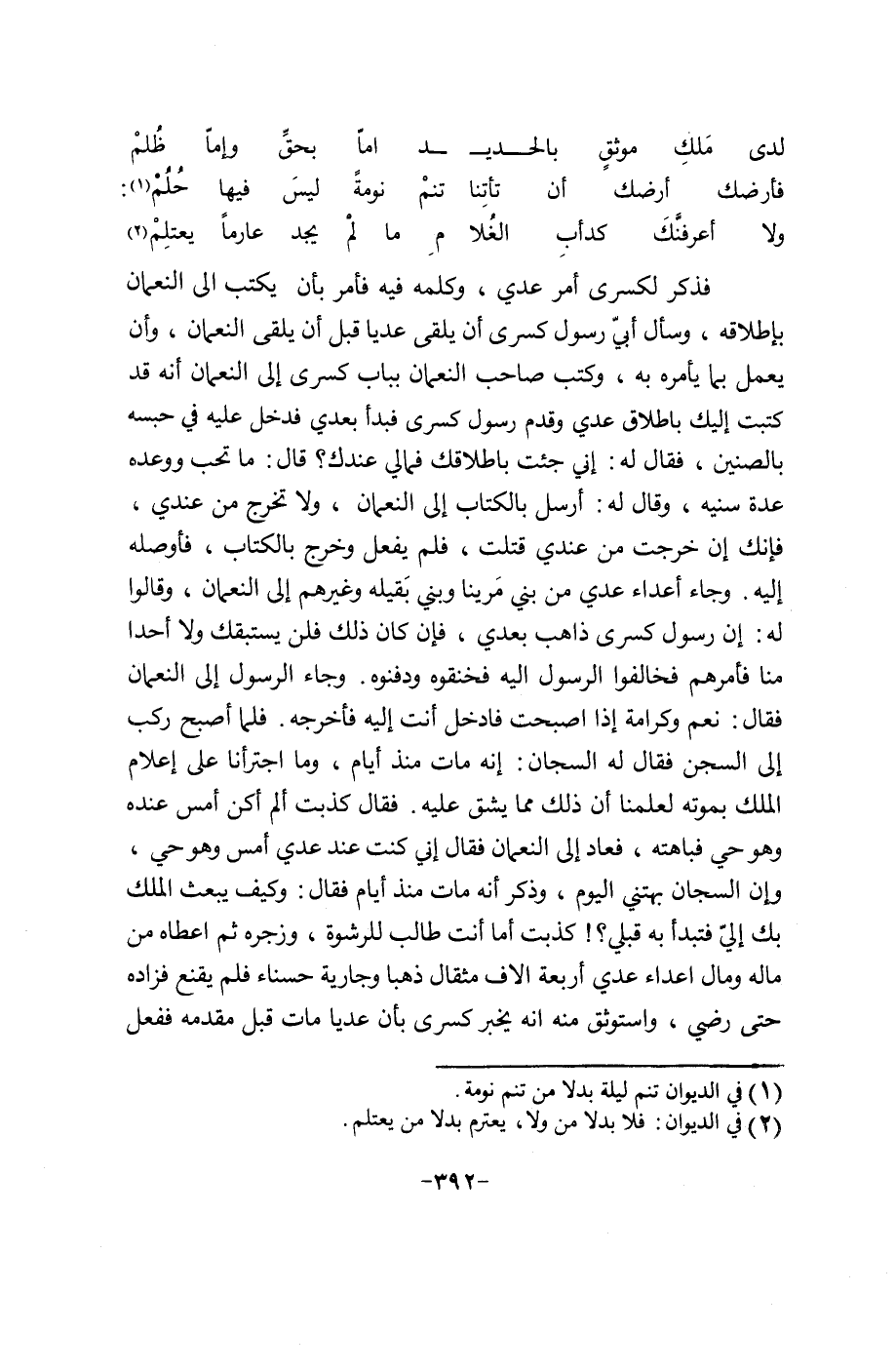 فذكر لكسرى أمر عدي، وكلمه فيه فامر بأن يكتب إلى النعمان باطلاقه، وسأل أبيّ رسول كسرى إن يلقى عدياً قبل إن يلقى النعمان، وإن يعمل بما يأمره به، وكتب صاحب النعمان بباب كسرى إلى النعمان إنه قد كتبت اليك باطلاق عدي وقدم رسول كسرى فبدأ بعدي فدخل عليه في حبسة بالصنين، فقال له: أني جئت بأطلاقك فمالي عندك؟ قال: ما تحب ووعده عده سنيه، وفقال له: أرسل بالكتاب إلى النعمان، ولا تخرج من عندي، فانك إن خرجت من عندي قتلت، فلم يفعل وخرج بالكتاب، فأوصله إليه. وجاء أعداء عدي من بني مرينا وبني بقيله وغيرهم إلى النعمان. وقالوا له: إن رسول كسرى ذاهب بعدي، فان كان ذلك فلن يستبقك ولا أحداً منا فامرهم فخالفوا الرسول إليه فخنقوه ودفنوه. وجاء الرسول إلى النعمان فقال: نعم وكرامة إذا أصبحت فأدخل أنت إليه فأخرجه. فلما أصبح ركب إلى السجن فقال له السجان: إنه مات منذ أيام، وما اجترأنا على أعلام الملك بموته لعلمنا إن ذلك مما يشق عليه. فقال كذبت الم أكن أمس عنده وهو حي فباهته، فعاد إلى النعمان فقال أني كنت عند عدي أمس وهو حي، وإن السجان بهتني اليوم، وذكر إنه مات منذ أيام فقال: وكيف يبعث الملك بك اليّ فتبدأ به قبلي؟! كذبت أما أنت طالب للرشوة، وزجره ثم أعطاه من ماله ومال أعداء عدي أربعة آلاف مثقال ذهباً وجارية حسناء فلم يقنع فزاده حتى رضي، وأستوثق منه إنه يخبر كسرى بأن عدي مات قبل مقدمه ففعل