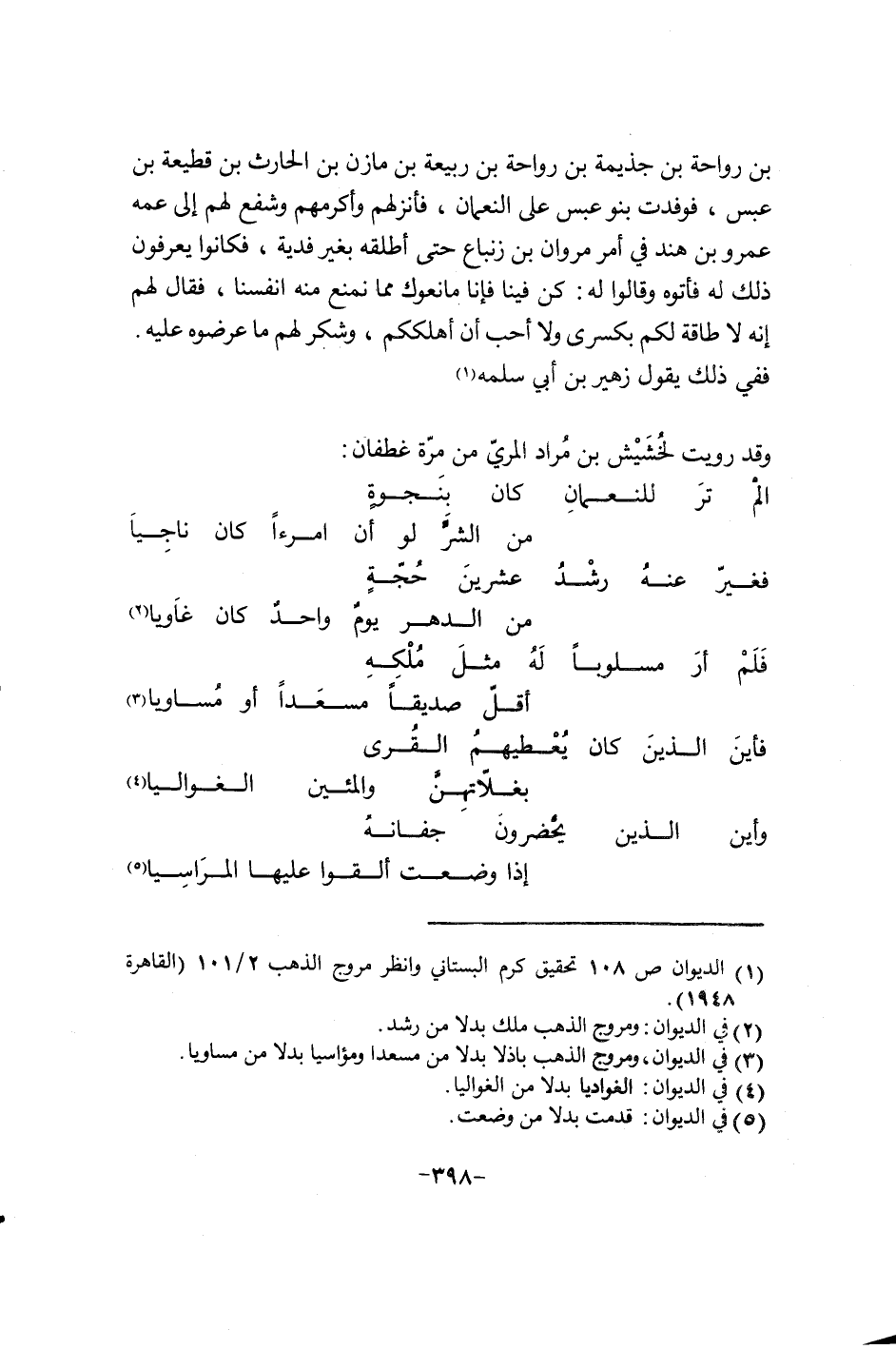 بن رواحة بن جذيمة بن رواحة بن ربيعة بن مازن بن الحارث بن قطيعة بن عبس، فوفدت بنو عبس على النعمان، فانزلهم وأكرمهم وشفع لهم إلى عمه عمرو بن هند في أمر مروان بن زنباع حتى أطلقه بغير فدية، فكانوا يعرفون ذلك له فأتوه وقالوا له: كن فينا فأنا مانعوك مما نمنع منه أنفسنا، فقال لهم إنه لا طاقة لكم بكسرى ولا أحب إن أهلككم، وشكر لهم ما عرضوه عليه. ففي ذلك يقول زهير بن أبي سلمه