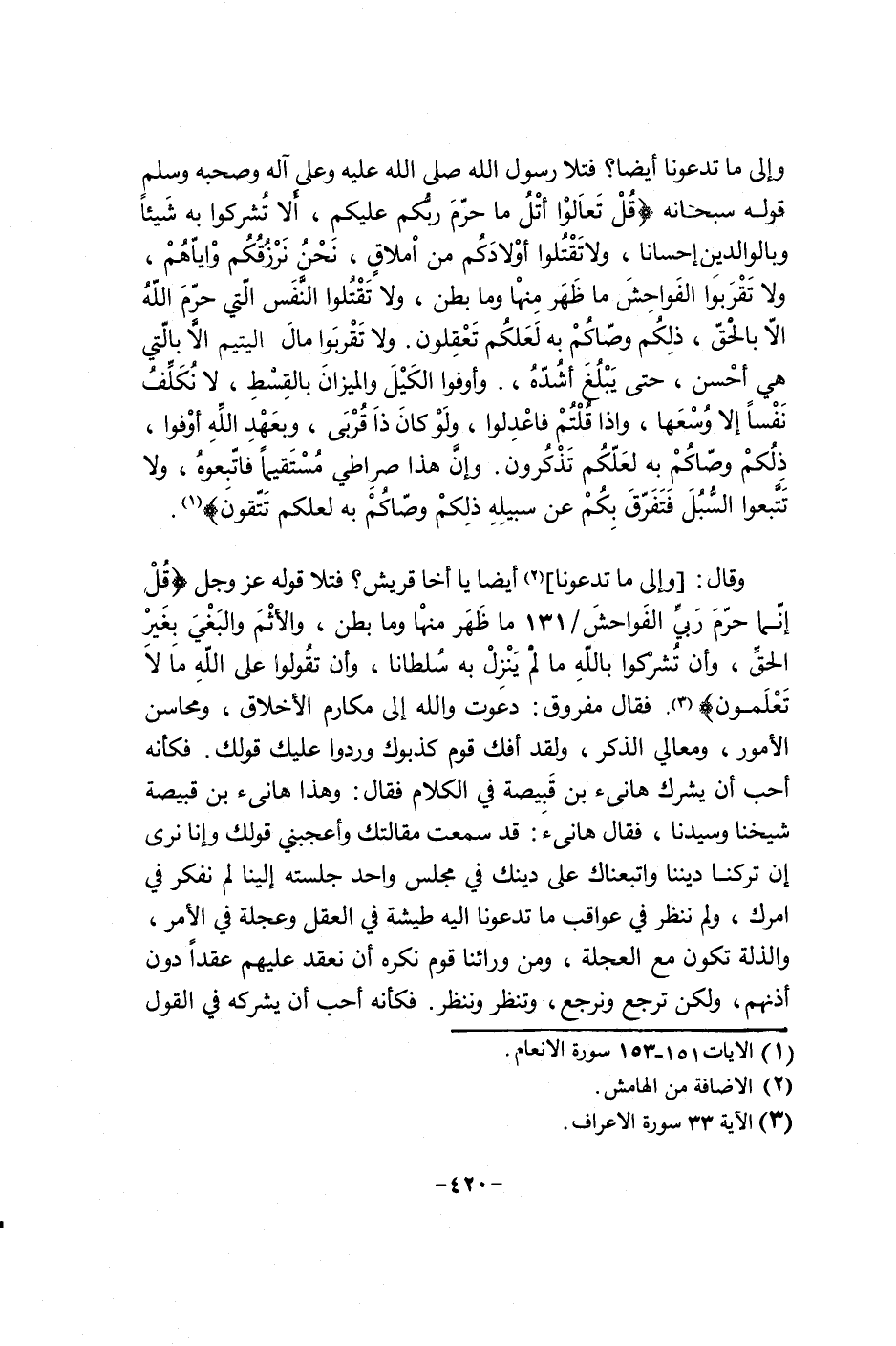 والأهم ما تدعون أيضا؟ فتلا رسول الله (قوله سبحانه (قل تعالوا أتل ما حرم ربكم عليكم، ألا تشركن به شيئا وبالوالدين إحسانا، ولا تقتلوا أولادكم من إملاق، فنحن نرزقكم وإياهم، ولا تقربوا الفواحش ما قرب منها وما بطن، ولا تقتلوا النفس التي حرم الله ألا بالحق، ذلكم وصاكم به لعلكم تعقلون، ولا تقربوا مال اليتيم ألا بالتي هي أحسن، حتى يلغ أشده، وأوفوا الكيل والميزان بالقسط، ولا نكلف نفسا ألا وسعها، وإذا قلتم فاعدلوا، ولو كان ذا قربى، وبعهد الله أوفوا، ذلكم وصاكم به لعلكم تذكرون، وإن هذا صراطي مستقيما فاتبعوه، ولا تتبعوا السبل فتفرقوا بكم عم سبيله ذلكم وصاكم به لعلكم تتقون) .