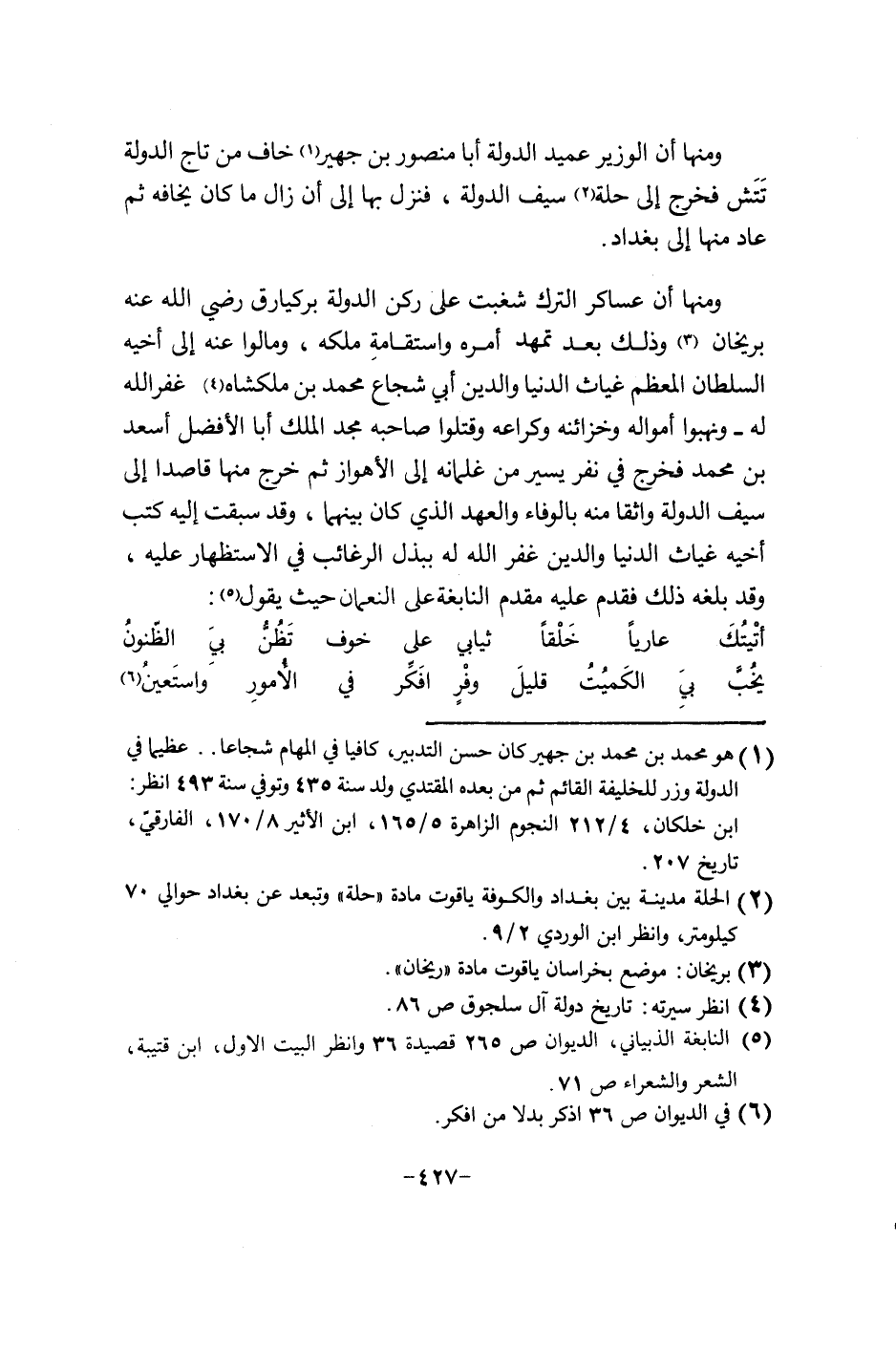 ومنها إن الوزير عميد الدولة أبا منصور بن جهير خاف من تاج الدولة تتش فخرج ألقى حلة سيف الدولة، فنزل بها ألقى إن زال ما كان يخافه ثم عاد منها ألقى بغداد.