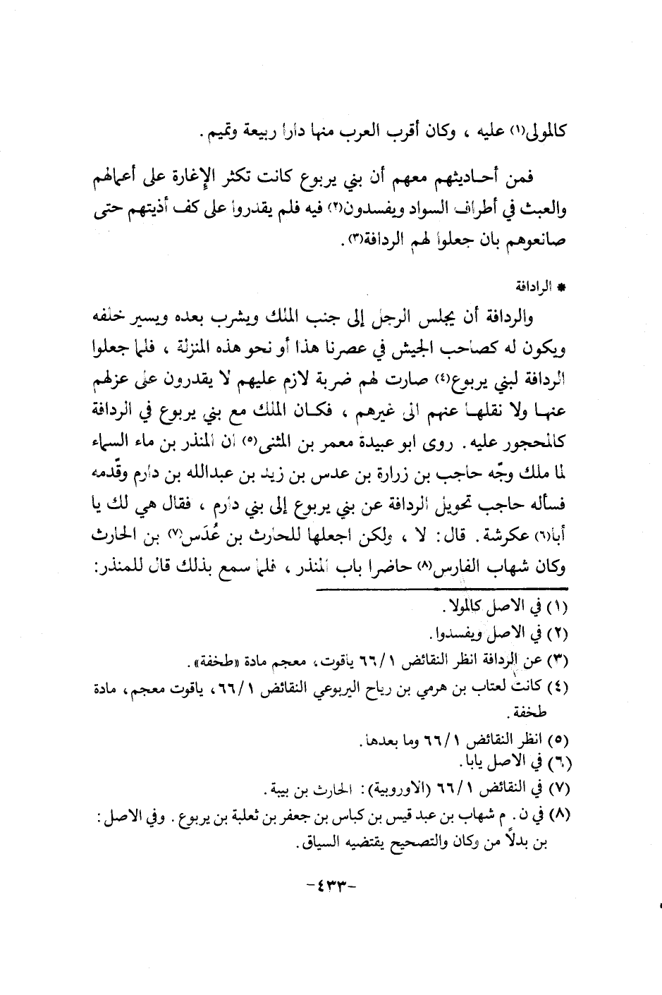 فمن أحاديثهم معهم إن بني يربوع كانت تكثر الإغارة على أعمالهم والعبث في أطراف السواد ويفسدون فيه فلم يقدروا على كف أذيتهم حتى صانعوهم بان جعلوا لهم الردفة.