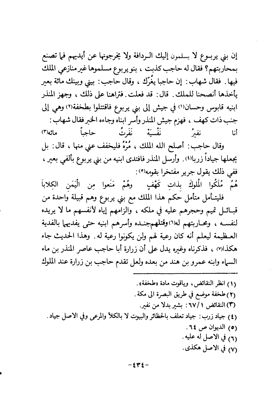 فليتأمل متأمل حكم هذا الملك مع بني يربوع وهم قبيلة واحدة من قبائل تميم وحجرهم عليه في ملكه والزامهم إياه لأنفسهم ما لا يريده لنفسه ومحاربتهم له وقتلهم جنده وأسرهم أبنيه حتى يفديهما بالفدية العظيمة ليعلم إنه كان رعية لهم ولن يكون رعية له. وهذا الحديث جاء هكذا فذكرناه وغيره يدل على إن زرارة أبا حاجب عاصر المنذر بن ماء السماء وأبنه عمرو بن هند من بعده ولعل تقدم حاجب بن زرارة عند الملوك