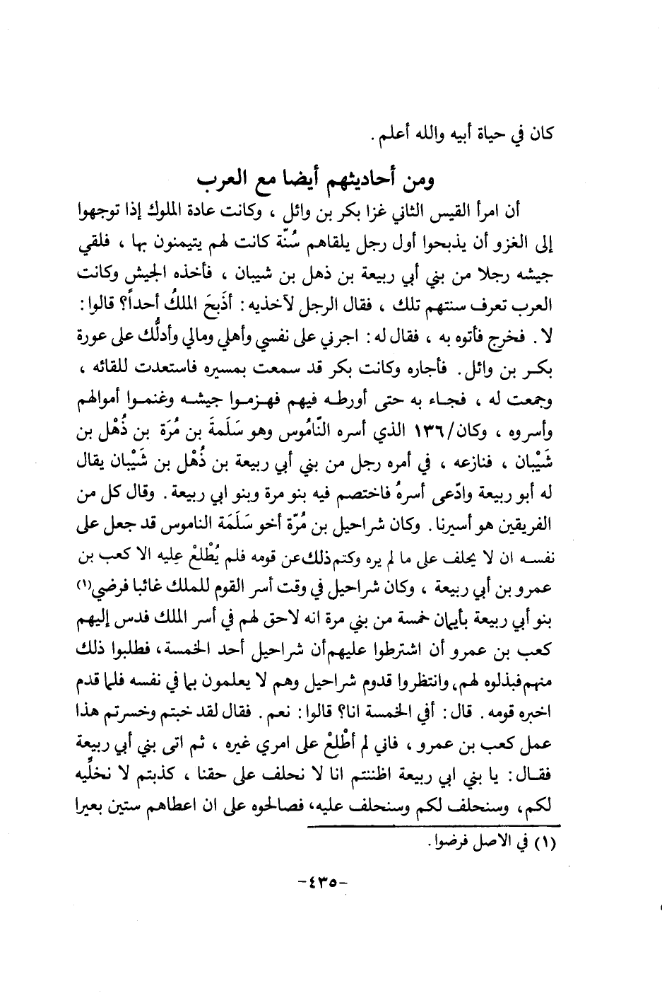 أن امرأ القيس الثاني غزا بكر بن وائل وكانت عادة الملوك إذا توجهوا ألف الغزو إن يذبحوا أول رجل يلقاهم سنة كانت لهم يتيمنون بها فلقي جيشه رجلا من بني أبي ربيعة بن ذهل بن شيبان فأخذه الجيش وكانت العرب تعرف سنتهم تلك فقال الرجل لآخذيه: أذبح الملك أحدا؟ قالوا: لا. فخرج فأتوا به فقال له: أجرني على نفسي وأهلي ومالي وأدلك على عورة بكر بن وائل. فأجاره وكانت بكر قد سمعت بمسيره فاستعدت للقائه وجمعت له فجاء به حتى أورطهم فيهم فهزموا جيشه وغنموا أموالهم وأسروه وكان136 الذي أسره الناموس وهو سلمة بن مرة بن ذهل بن شيبان فنازعه في أمره رجل من بني أبي ربيعة بن ذهل بن شيبان يقال له أبو ربيعة وأدعى أسره فاختصم فيه بنو مرة وبنو أبي ربيعة. وقال كل من الفريقين هو أسيرنا. وكان شراحيل بن مرة أخو سلمة الناموس قد جعل على نفسه إن لا يحلف على ما لم يره وكتم ذلك عن قومه فلم يطلع عليه أبوكم كعب بن عمرو بن أبي ربيعة وكان شراحيل في وقت أسر القوم للملك غائب فرضي بنو أبي ربيعة بأيمان خمسة من بني مرة إنه لاحق لهم في أسر الملك فدس الأعشى كعب بن عمرو إن اشترطوا عليه إن شراحيل أحد الخمسة فطلبوا ذلك منهم فبذلوه لهم وانتظروا قدوم شراحيل وهم لا يعلمون بما في نفسه فلما قدم أخبره قومه. قال: أفي الخمسة أنا؟ قالوا: نعم فقال لقد خبتم وخسرتم هذا عمل كعب بن عمرو فأني لم أطلع على أمري غيره ثم أتى بني أبي ربيعة فقال: يا بني أبي ربيعة أظننتم أنا لا نحلف على حقنا كذبتم لا نخليه لكم وسنحلف لكم وسنحلف عليه فصالحوه على إن أعطاهم ستين بعيرا