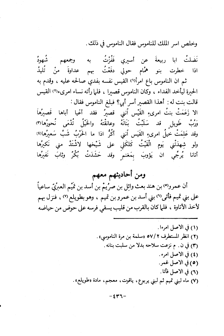 ثم إن الناموس باع امرأ القيس نفسه بفدي صالحه عليه وقدم به الحيرة ليأخذ الفداء وكان الناموس قصيرا فلما رأته نساء امرئ القيس قالت بنت له: أهذا القصير أسر أبي؟ فبلغ الناموس فقال: