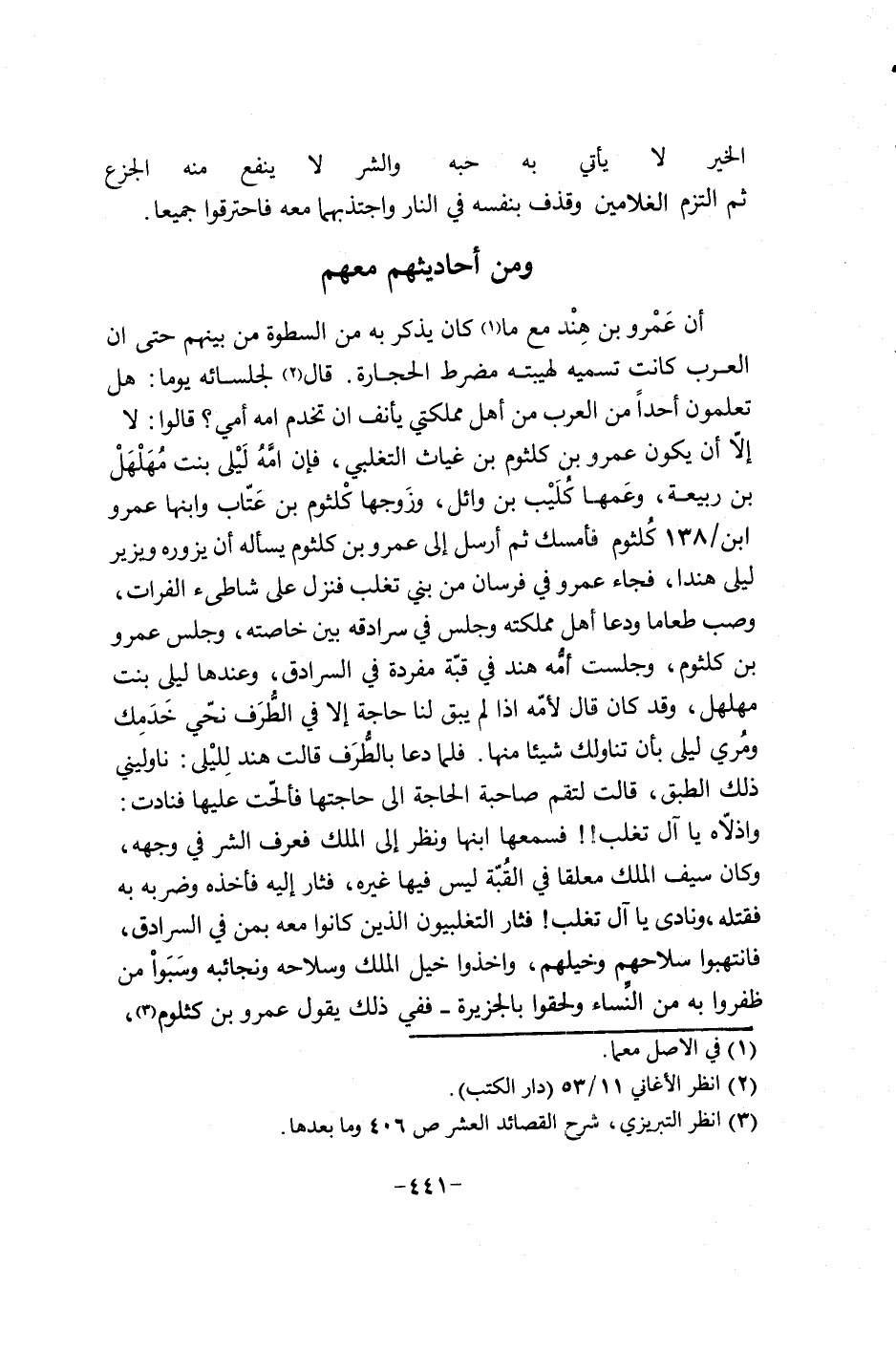 أن عمر وبن هند مع ما كان يذكر به من السطور من بينهم حتى إن العرب كانت تسميه لهيبته مضرط الحجارة. قال لجلسائه يوماً: هل تعلمون أحداً من العرب من أهل مملكتي يأنف إن تخدم أمه أمي؟ قالوا: لا إلا أن يكون عمرو بن كلثوم بن غياث التغلبي، فإن أمه ليلى بنت مهلهل بن ربيعة. وعمها كليب بن وائل. وزوجها كلثوم بن عتاب وأبنها عمرو أبن138 كلثوم فأمسك ثم أرسل إلى عمرو بن كلثوم أن يزوره ويزور ليلى هنداً. فجاء عمرو في فرسان من بني تغلب فنزل في شاطئ الفرات، وصب طعاماً ودعا أهل مملكته وجلس في سرادقه بين خاصته، وجلس عمرو بن كلثوم، وجلست أمه هند في قبة منفردة في السرادق، وعندها ليلى بنت مهلهل، وقد كان قال لأمه إذا لم يبق لنا حاجة إلا في الطرف نحي خدمك ومري ليلى بأن تناولك شيئاً منها، فلما دعا بالطرف؟؟؟؟؟؟؟؟؟؟؟؟؟؟؟؟؟؟؟؟؟؟؟؟؟؟؟؟؟؟؟؟؟؟؟؟؟؟؟؟؟؟؟؟؟؟؟؟؟؟؟؟؟؟؟؟؟؟؟؟؟؟؟؟؟؟؟؟؟؟؟؟؟؟؟؟؟؟؟؟؟؟؟؟؟؟؟؟؟؟؟؟؟؟؟؟؟؟؟؟؟؟؟؟؟؟؟؟؟؟؟؟؟؟؟؟؟؟؟؟؟؟؟؟؟؟؟؟؟؟؟؟؟؟؟؟؟؟؟؟؟؟؟؟؟؟؟؟؟؟؟؟؟؟؟؟؟؟؟؟؟؟؟؟؟؟؟؟؟؟؟؟؟؟؟؟؟؟؟؟؟؟؟؟؟؟؟؟؟؟؟؟؟؟؟؟؟؟؟؟؟؟؟؟؟؟؟؟؟؟؟؟؟؟؟؟؟؟؟؟؟؟؟؟؟؟؟؟؟؟؟؟؟؟؟؟؟؟؟؟؟؟؟؟؟؟؟؟؟؟؟؟؟؟؟؟ ثار التغلبيون الذين كانوا معه بمن في السرادق، فانتهبوا سلاحهم وخيولهم، وأخذوا خيل الملك وسلاحه ونجائبه وسبوا من ظفروا به من النساء ولحقوا بالجزيرة - ففي ذلك يقول عمرو بن كلثوم،