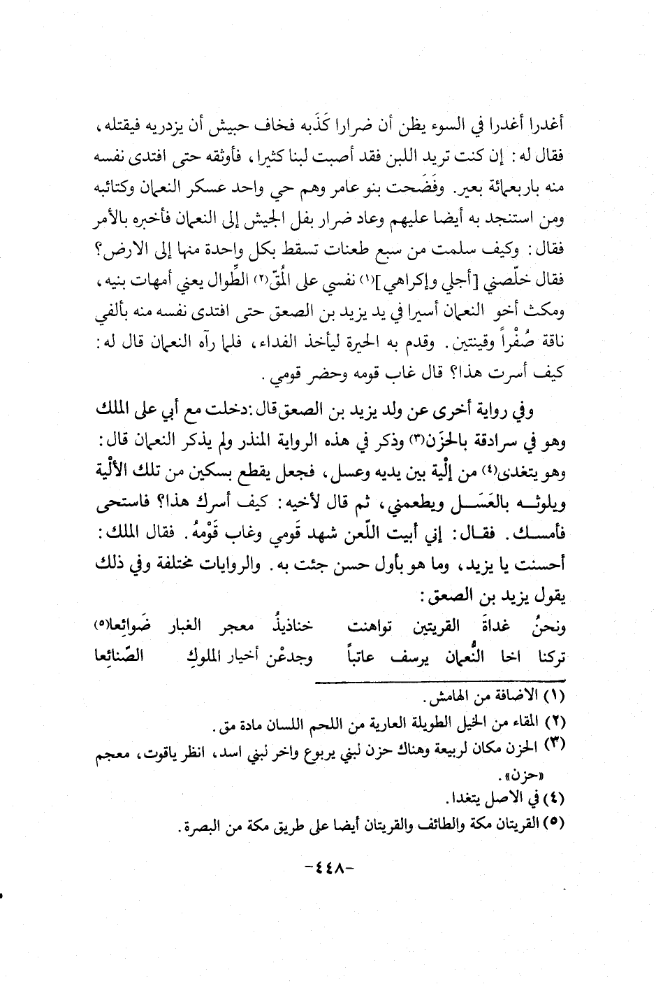 وفي رواية أخرى عن ولد يزيد بن الصعق قال: دخلت مع أبي على الملك وهو في سرداقه بالحزن وذكر في هذه الرواية المنذر ولم يذكر النعمان قال: وهو يتغدى من إلية بين يديه وعسل، فجعل يقطع بتلل السكين من تلك الإلية ويلوثه بالعسل ويطعمني، ثم قال لأخيه: كيف أسرك هذا؟ فاستحى فأمسك. فقال: أني أبيت اللعن شهد قومي وغاب قومه. فقال الملك: أحسنت يا زيد، وما هو بأول حسن جئت به. والروايات مختلفة وفي ذلك يقول زيد بن الصعق: