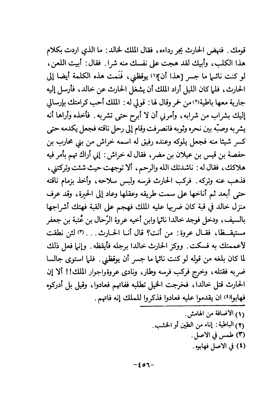 قومك. فنهض الحارث يجر رداءه، فقال الملك لخالد: ما الذي أردت بكلام هذا الكلب، وأبيك لقد هجت على نفسك منه شرا. فقال: أبيت اللعن، لو كنت نائما ما جسر هذا إن يوقظني، فنمت هذه الكلمة أيضاً الدولة الحارث، فلما كان الليل أراد الملك إن يشغل الحارث عن خالد، فأرسل ألي جارية معها باطية من خمر وقال لها: قولي له الملك أحب كرامتك بإرسالي إليك بشراب من شرابه وأمرني إن لا أبرح حتى تشربه. فأخذه وأراها إنه يشربه ويصبه بين نحره وثوبه فانصرفت وقام الدولة رحل ناقته فجعل يكدمه حتى كسر شيئا منه فجعل يلوكه وعنده رفيق له أسمه خراش من بني محارب بن حفصة بن قيس بن عيلان بن مضر فقال له خراش: أني أراك تهم بأمر فيه هلاكك فقال له: ناشدتك الله والرحم الإلية توجهت حيث شئت وتركتني فذهب عنه وتركه. فركب الحارث فرسه ولبس سلاحه وأخذ بزمام ناقته حتى أبعد ثم أناخها على سمت طريقه وعقالها وعاد الدولة الحيرة وقد عرف منزل خالد في قبة كان ضربها عليه الملك فهجم على القبة فهتك أشراجها بالسيف ودخل فوجد خالدا نائما وأبن أخيه عروة الرحال بن عتبة بن جعفر مستيقظا فقال عروة: من أنت؟ قال أنا الحارث لئن نطقت لأعممتك به فسكت. ووكز الحارث خالدا برجله فأيقضه. وإنما فعل ذلك لما بلغه من قوله لو كنت نائما ما جسر ويمقظني. فلما استوى جالسا ضربه فقتله وخرج فركب فرسه وطار ونادى عروة وأ جوار الملك!! الإلية إن الحارث قتل خالدا فخرجت الخيل تطلبه ففاتهم فعادوا وقيل بل أدركوه فهابوا إن يقدموا عليه فعادوا فذكروا للملك إنه فاتهم.