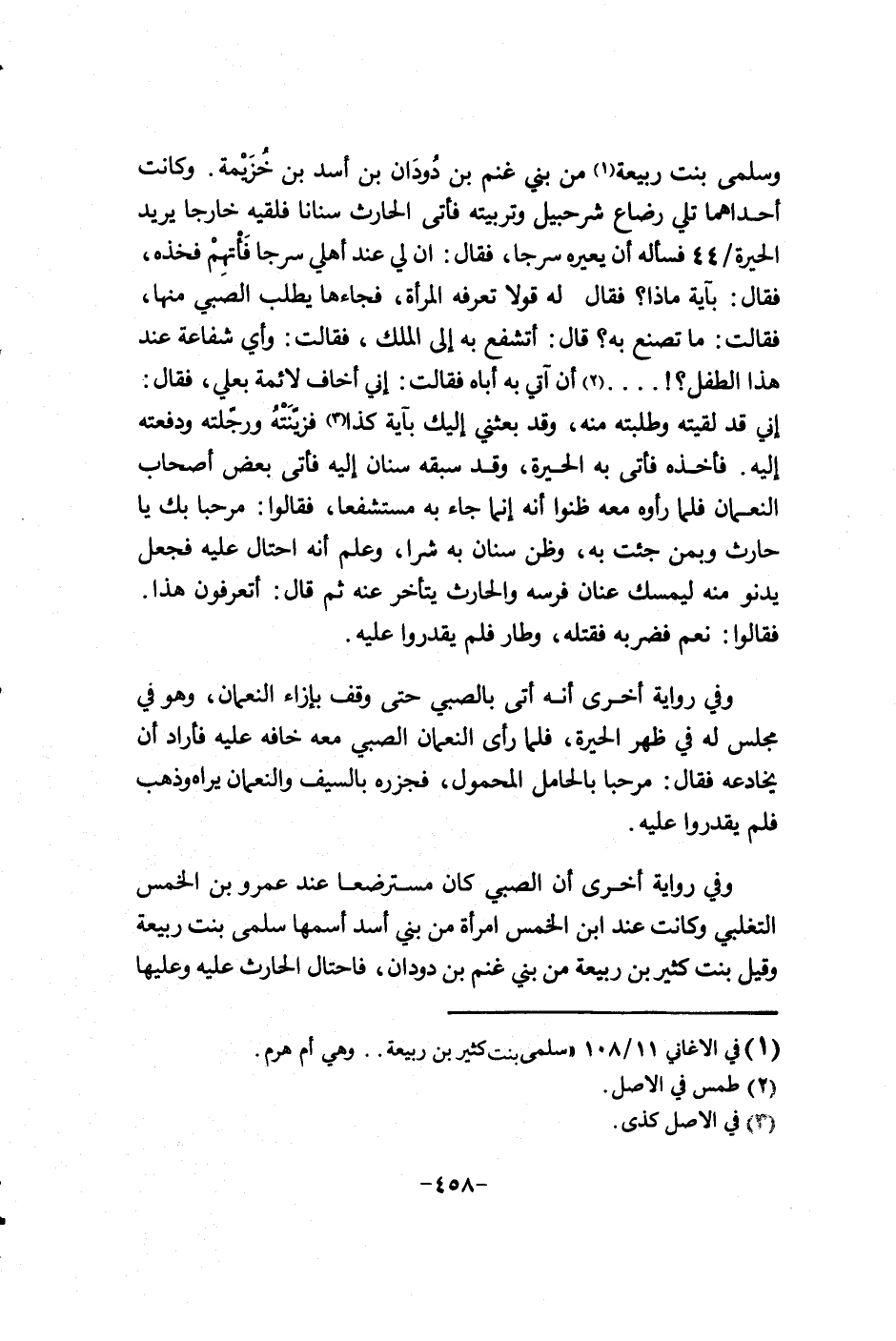 وسلمى بنت ربيعة من بني غنم بن دودان بن أسد بن خُزَيمة. وكانت إحداهما تلي رضاع شرحبيل وتريتهفأتى الحارث سناناً فلقيه خارجاً يرد الحيرة44 فسأله أن يعيره سرجاً، فقال: إن لي عند أهلي سرجاً فأتخم فخذه، فقال: بآية ماذا؟ فقال له قولاً تعرفه المرأة، فجاءها يطلب الصبي منها، فقالت: ما تصنع به؟ قال: أتشفع به إلى الملك، فقالت: وأي شفاعة عند هذا الطفل؟! 000أن آتي به أباه فقالت: إني أخاف لائمة بعلي، فقال: إني قد لقيته وطلبته منه، وقد بعثني إليك بآية كذا فزينته ورجلته ودفعته إليه. فأخذه فأتى به الحيرة، وقد سبقه سنان إليه فأتى بعض أصحاب النعمان فلما رأوه معه ظنوا إ أنه إنما جاء به مستشفعاً، فقالوا: مرحباً بك يا حارث وبمن جئت به، وظن سنان به شراً، وعلم إنه أحتال عليه فجعل يدنو منه ليمسك عنان فرسه والحارث يتأخر عنه ثم قال: أتعرفون هذا. فقالوا نعم فضربه فقتله، وطار فلم يقدروا عليه.
