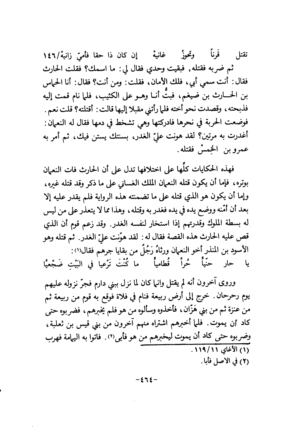 فهذه الحكايات كلها على اختلافها تدل على إن الحارث فات النعمان بوتره، فإما إن يكون قتله النعمان الملك الغساني على ما ذكر وقد قتل غيره، وأما إن يكون هو الذي قتله على ما تضمنته هذه الرواية فلم يقدر عليه الإلية بعد إن أمنه ووضع يده في يده فغدر به فقتله، وهذا مما لا يعتذر على من ليس له بسطة الملوك وقدراتهم إذا استخار لنفسه الغدر. وقد زعم قوم إن الذي قص عليه الحارث هذه القصة فقال له: لقد هونت علي الغدر. ثم قتله وهو الأسود بن المنذر أخو النعمان ورثاه رجل من بقايا جرهم فقال: