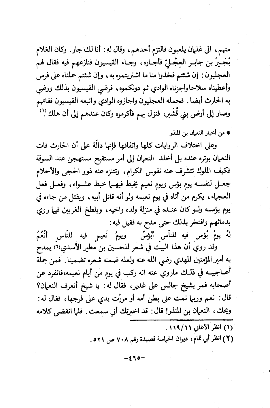 وعلى اختلاف الروايات كلها واتفاقها فإنها دالة على أن الحارث فات النعمان بوتره عنده بل أخلد النعمان إلى أمر مستقبح مستهجن عند السوقة فكيف الملوك تتشرف عنه نفوس الكرام، وتتنزه عنه ذوو الحجى والأحلام جعل لنفسه يوم بؤس ويوم نعيم يخبط فيهما خبط عشواء، وفعل فعل العجماء، يكرم من أتاه في يوم نعيمه ولو إنه قاتل أبيه، ويقتل من جاءه في يوم بؤسه ولو كان عنده في منزلة ولده وأخيه، وياطخ الغريين فيما روي بدمائهم وأفتخر بذلك حتى مدح به فقيل فيه: