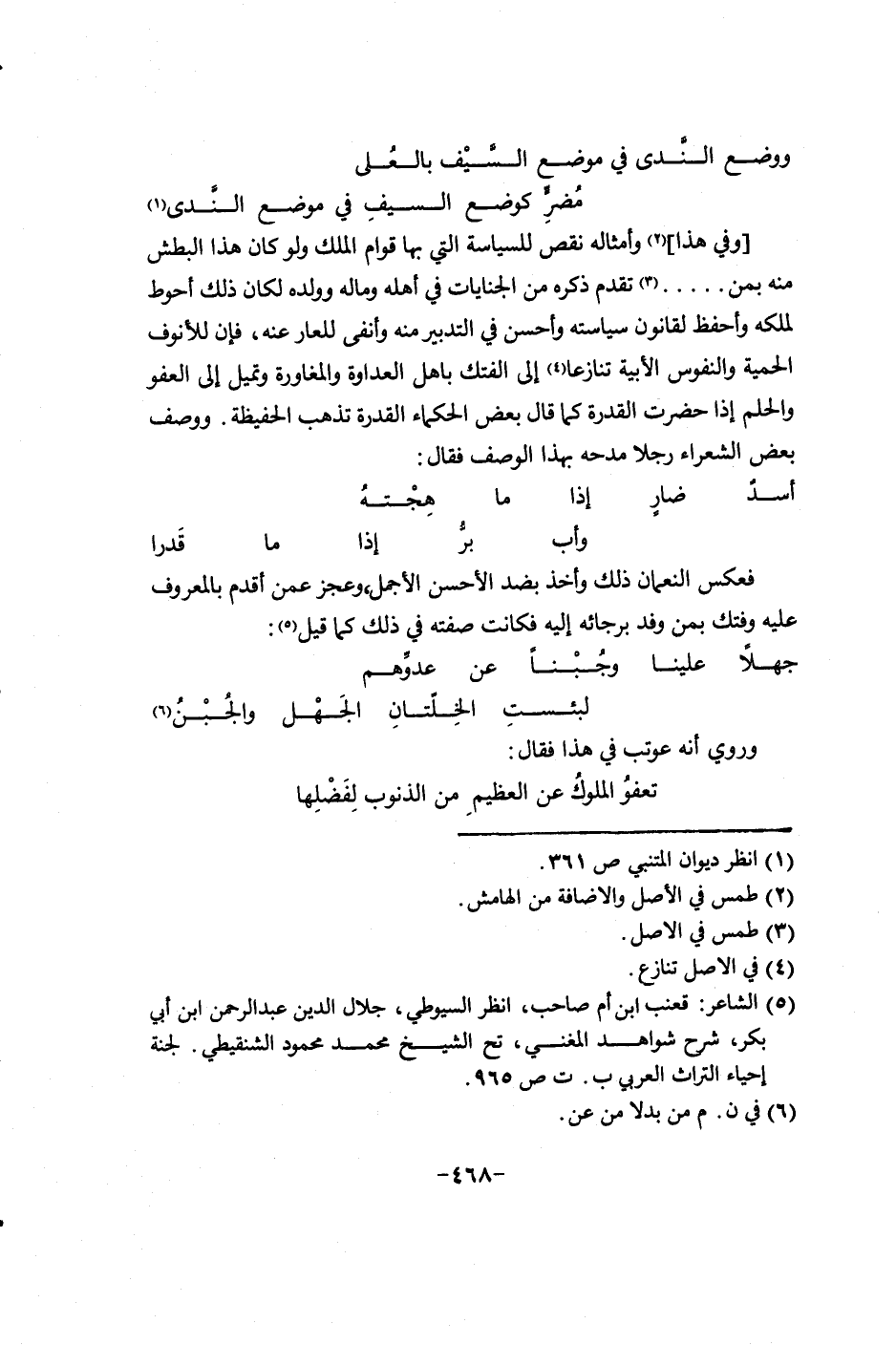 وفي هذا وأمثاله نقص للسياسة التي بها قوام الملك ولو كان هذا البطش منه بمن0000تقدم ذكره من الجنايات في أهله وماله وولده لكان ذلك أحوط لملكه وأحفظ لقانون سياسته وأحسن في التدبير منه وأنفى للعار عنه، فان للأنوف الحمية والنفوس الإبل تنازعاً الدولة الفتك بأهل العداوة والمغاورة وتميل الدولة العفو والحلم إذا حضرت القدرة كما قال بعض الحكماء القدرة تذهب الحفيظة. ووصف بعض الشعراء رجلاً مدحه بهذا الوصف فقال: