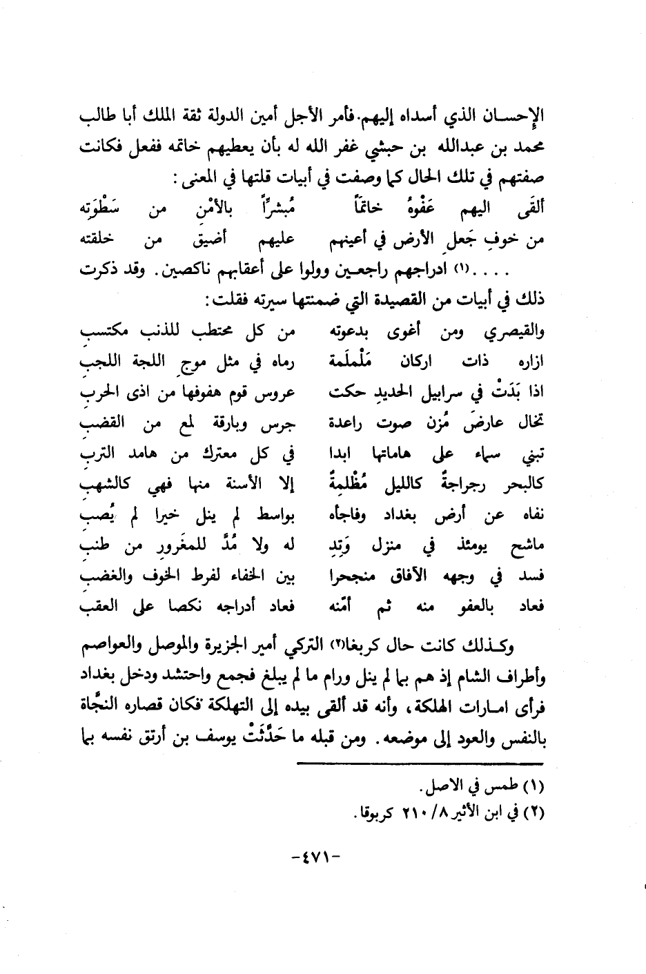 وكذلك كانت حال كربغا التركي أمير الجزيرة والموصل والعواصم وأطراف الشام إذ هم بما لم ينل ورام ما لم يبلغ فجمع وأحتشد ودخل بغداد فرأى إمارات الهلكة، وإنه قد ألقى بيده الدولة التهلكة فكان قصاره النجاة بالنفس والعود الدولة موضعه. ومن قبله ما حدثت يوسف بن أرتق نفسه بما