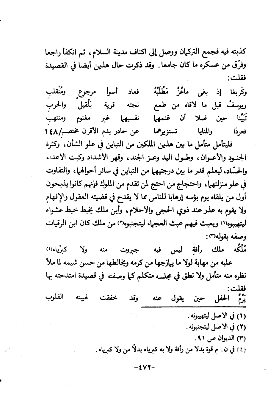 فليتأمل متأمل ما بين هذين الملكين من التباين في علو الشأن، وكثرة الجنود والأعوان، وطول اليد وعز الجند، وقهر الاشداد وكبت الأعداء والحساد، ليعلم قد ما بين درجتيهما من التباين في سائر أحوالهما، والتفاوت في علو منزلتهما، وأحتجاج من أحتج لمن تقدم من الملوك فانهم كانوا يذبحون أول من يلقاه يوم بؤسه إرهابا للناس مما لا يقدح في قضيته العقول والإفهام ولا يقوم به عذر عند ذوي الحجى والأحلام، وأين ملك يخبط خبط عشواء ليتهيبوه ويعبث فيهم عبث العجماء ليتجنبوه من ملك كان أبن الرقيات وصفه بقوله: