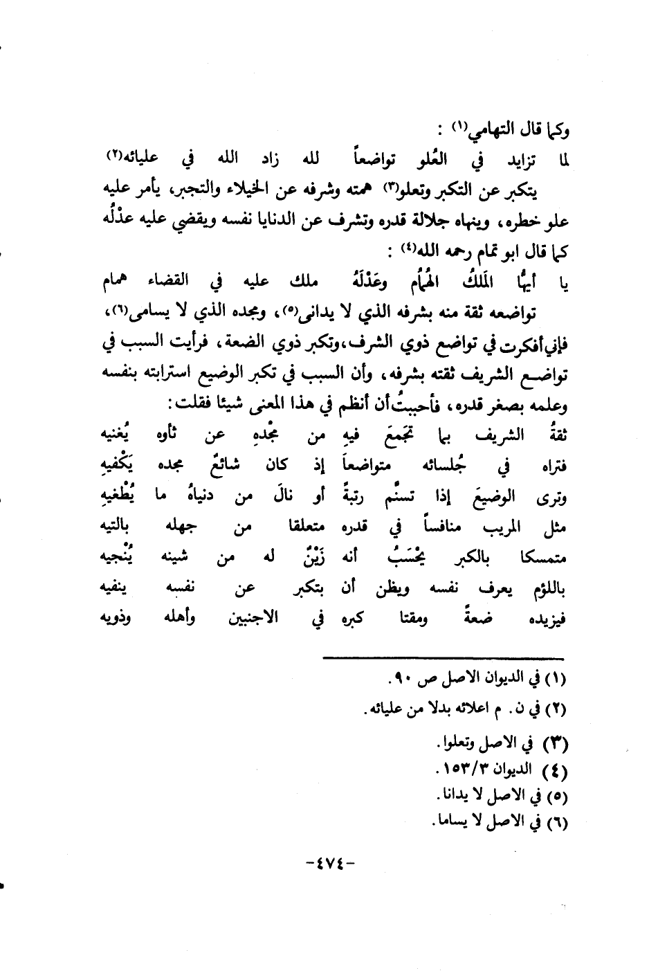 تواضعه ثقة منه بشرفه الذي لا يدانى، ومجده الذي لا يسامى، فأني أفكرت في تواضع ذوي الشرف، وتكبر ذوي الضعة، فرأيت السبب في تواضع الشريف ثقته بشرفه، وإن سبب في تكبر الوضيع أسترابته بنفسه وعلمه بصغر قدره، فأحببت إن أنظم في هذا المعنى شيئاً فقلت:
