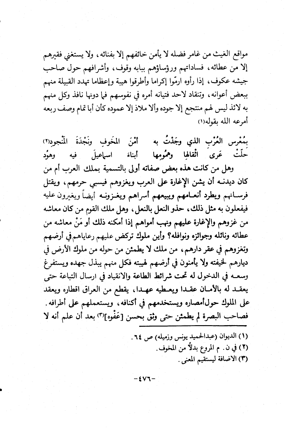 وهل من كانت هذه بعض صفاته أولى بالتسمية بملك العرب أم من كان يدنيه إن يشن الأعلام على العرب ويغزوهم فيسبي حرمهم، ويقتل فرسانهم ويطرد إنعامهم ويبيعهم أسراهم ويغزونه أيضاً ويغيرون عليه فيفعلون به مثل ذلك، حذو النعل بالنعل، وهل ملك القوم من كان معاشه من عطائه ونائله وجوائزه ونوافله؟ وأين ملوك تركض عليهم رعاياهم في أرضهم وتغزوهم في عقر دارهم، من ملك لا يطمئن من حوله من ملوك الأرض في ديارهم لخيفته ولا يأمنون في أرضهم لهيبته فكل منهم يبذل جهده ويستفرغ وسعه في الدخول له تحت شرائط الطاعة والانقياد في إرسال التباعة حتى يعقد له بالأمان عقداً ويعطيه عهداً، يقطع من العراق أقطاره ويعقد على الملوك حول أمصاره ويستخدمهم في أكنافه، ويستعملهم على أطرافه. فصاحب البصرة لم يطمئن حتى وثق بحسن عفوه بعد إن علم إنه لا