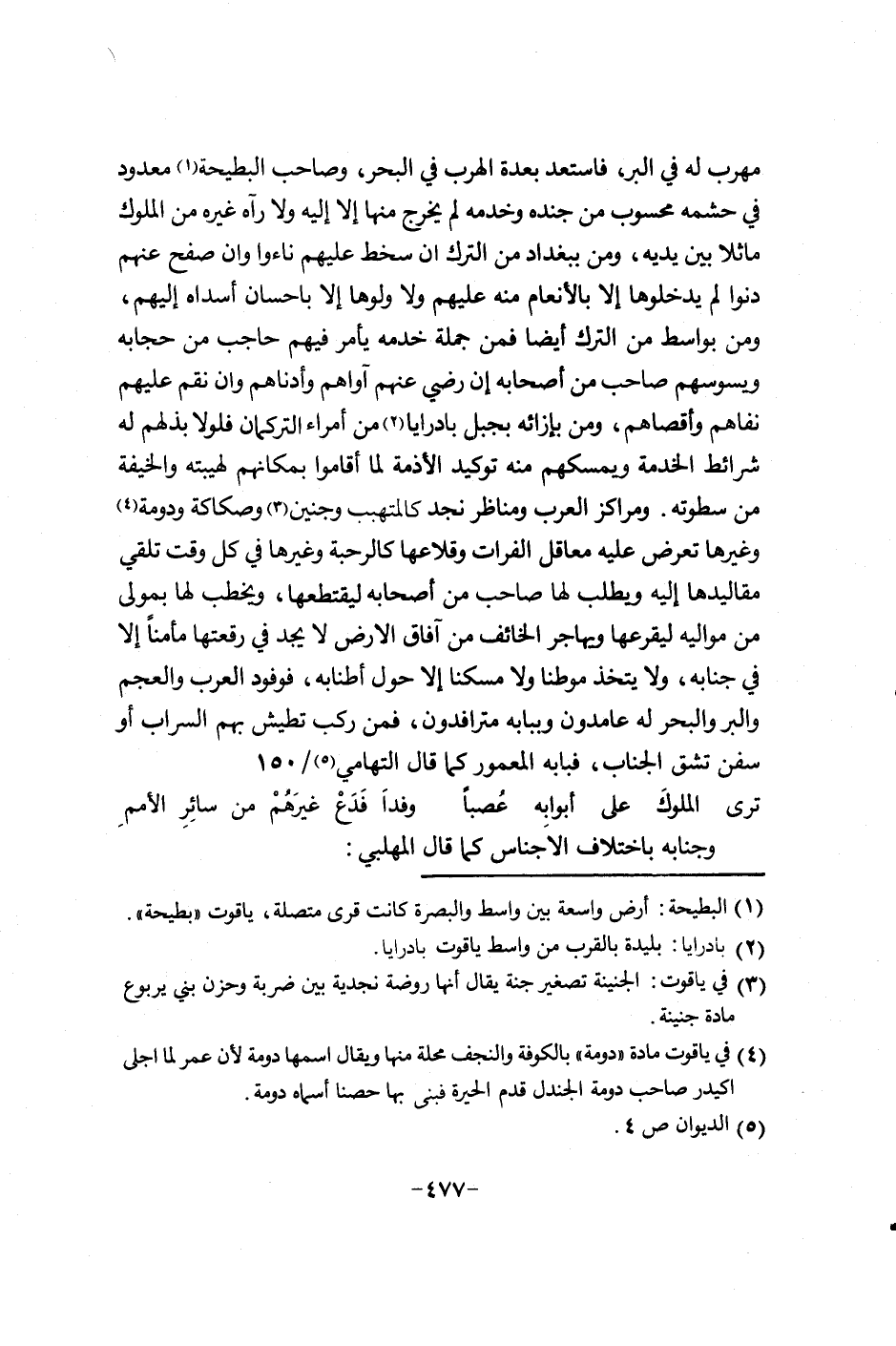مهرب له في البر، فاستعد بعدة الهرب في البحر، وصاحب البطيحة معدود في حشمه محسوب من جنده وخدمه لم يخرج منها الإلية ألي ولا رأه غيره من الملوك مائلا بين يديه، ومن ببغداد من الترك إن سخط عليهم ناءوا وإن صفح عنهم دنوا لم يدخلوها الدولة بالأنعام منه عليهم ولولا ولوها الإلية بإحسان أسداه إلى، ومن بواسط من الترك أيضاً فمن جملة خدمه يأمر فيهم حاجب من حجابه ويسوسهم صاحب من أصحابه إن رضي عنهم آواهم وأدناهم وإن نفم عليهم نفاهم وأقصاهم، ومن بازائه بجبل بادرايا من أمراء التركمان فلولا بذلهم له شرائط الخدمة ويمسكهم منه توكيد الاذمة لما أقاموا بمكانهم لهيبته والخيفة من سطوته. ومراكز العرب ومناظر نجد كالمتهبب وجنين وصكاكة ودومة وغيرها تعرض عليه معاقل الفرات وقلاعها كالرحبة وغيرها في كل وقت تلقي مقاليدها إلينا ويطلب لها صاحب من أصحابه ليقتطعها، ويخطب لها بمولى من مواليه ليقرعها ويهاجر الخائف من آفاق الأرض لا يجد في رقعتها مأمناً أباح في جنابه، ولا يتخذ موطناً ولا مسكناً أباح حول أطنابه، فوفود العرب والعجم والبر والبحر له عامدون وببابه مترافدون، فمن ركب تطيش بهم السراب أو سفن تشق الجناب، فبابه المعمور كما قال التهامي150