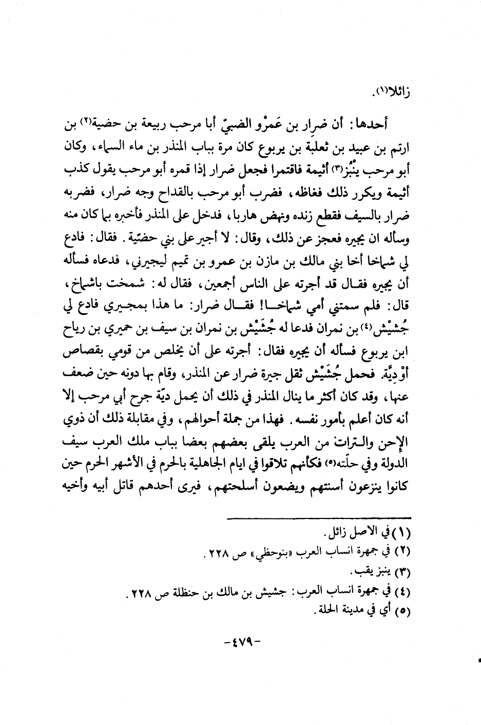 أحدها: إن ضرار بن عمرو الضبي أبا مرحب ربيعة بن حضية بن أرتم بن عبيد بن ثعلبة بن يربوع كان مرة بباب المنذر بن ماء السماء، وكان أبو مرحب ينبز أثيمة فاقتمرا فجعل ضرار إذا قمره أبو مرحب يقول كذب أثيمة ويكرر ذلك فغاظه، فضرب أبو مرحب بالقداح وأمطرت ضرار، فضرب ضرار بالسيف فقطع زنده ونهض هارباً، فدخل على المنذر فاخبره بما كان منه وسأله إن يجيره فعجز عن ذلك، وقال: لا أجير على بني حضية. فقال: فأدع لي شماخاً أخا بني مالك بن مازن بن عمرو بن تميم ليجيرني، فدعاه فسأله إن يجيره فقال قد أجرته على الناس أجمعين، فقال له: شمخت باشماخ، قال: فلم سمتني أمي شماخاً! فقال ضرار: ما هذا بمجيري فادع لي جشيش بن نمران فدعا له جشيش بن نمران بن سيف بن حميري بن رياح أبن يربوع فسأله إن يجيره فقال: أجرته على إن يخلص من قومي بقصاص أو ديَّة. فحمل حشيش ثقل جيرة ضرار عن المنذر، وقال بها دونه حين ضعف عنها، وقد كان أكثر ما ينال المنذر في ذلك إن يحمل ديَّة جرح أبي مرحب أباح إنه كان أعلم بأمور نفسه. فهذا من جمله أحوالهم، وفي مقابله ذلك إن ذوي الاحن والترات من العرب يلقي بعضهم بعضاً بباب ملك العرب سيف الدولة وفي حلته فكأنهم تلاقوا في أيام الجاهلية بالحرم في الأشهر الحرم حين كانوا ينزعون أسنتهم ويضعون أسلحتهم، فيرى أحدهم قالتل أبيه وأخيه