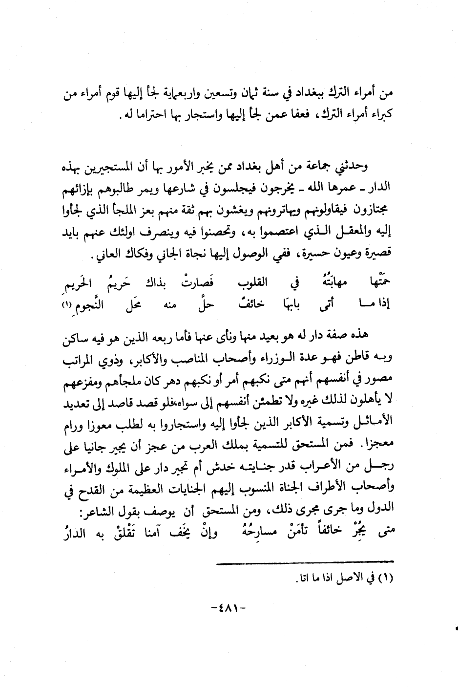 هذه صفت دار له هو بعيد منها ونأى عنها فأما ربعة الذي هو فيه ساكن وبه قاطن فهو عدة الوزراء وأصحاب المناصب والأكابر، وذوي المراتب مصور في أنفسهم إنهم متى نكبهم أمر أو نكبهم دهر كان ملجأهم ومفزعهم لا يأهلون لذلك غيره وتطمئن أنفسهم إلى سواه، فلو قصد قاص آلنا تعديد الأماثل وتسمية الأكابر الذين لجئوا إليه واستجاروا به لطلب معوزاً ورام معجزاً. فمن المستحق للتسمية بملك العرب من عجز أن يجير جانياً على رجل من اللأعراب قدر جنايته خدش أم تجير دار على الملوك والأمراء وأصحاب الأطراف الجناة المنسوب إليهم الجنايات العظيمة من القدح في الدول وما جرى مجرى ذلك، ومن المستحق أن يوصف بقول الشاعر: