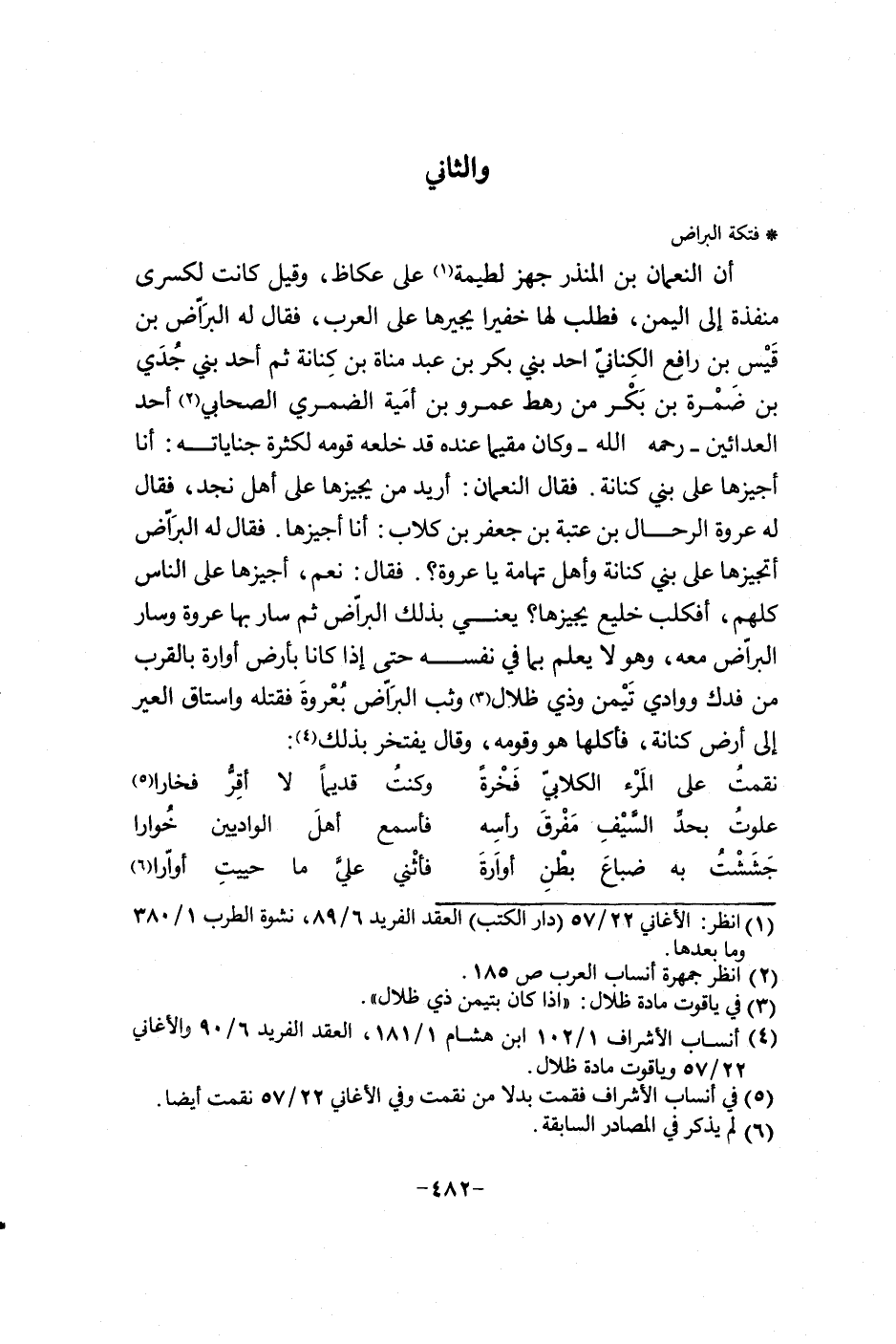 إن النعمان بن المنذر جهز لطيمة على عكاظ، وقيل كانت لكسرى منفذة آلنا اليمن، فطلب لها خفيراً يجيرها على العرب، فقال له البراض بن قيس بن رافع الكناني أحد بني بكر بن عبد مناة بن كنانة ثم أحد بني جدي بن ضمرة بن بكر من رهط عمرو بن أمية الضمري الصحابي أحد العدائين - رحمه الله - وكان مقيماً عنده قد خلعه قومه لكثرة جناياته: أنا أجيزها على بني كنانة. فقال النعمان: أُريد من يجيزها على أهل نجد، فقال له عروة أرحال بن عتبة بن جعفر بن كلاب: أنا أجيزها. فقال له البراض أتجيزها على بني كنانة وأهل تهامة يا عروة؟. فقال: نعم، أجيزها على الناس كلهم، أفكلب خليع يجيزها؟ يعني بذلك البراض ثم سار بها عروة وسار البراض معه، وهو لا يعلم بما في نفسه حتى إذا كانا بأرض أوارة بالقرب من فدك ووادي تيمن وذي ظلال وثب البراض بعروة فقتله وأستاق العير آلنا أرض كنانة، فأكلها هو وقومه، وقال يفتخر بذلك: