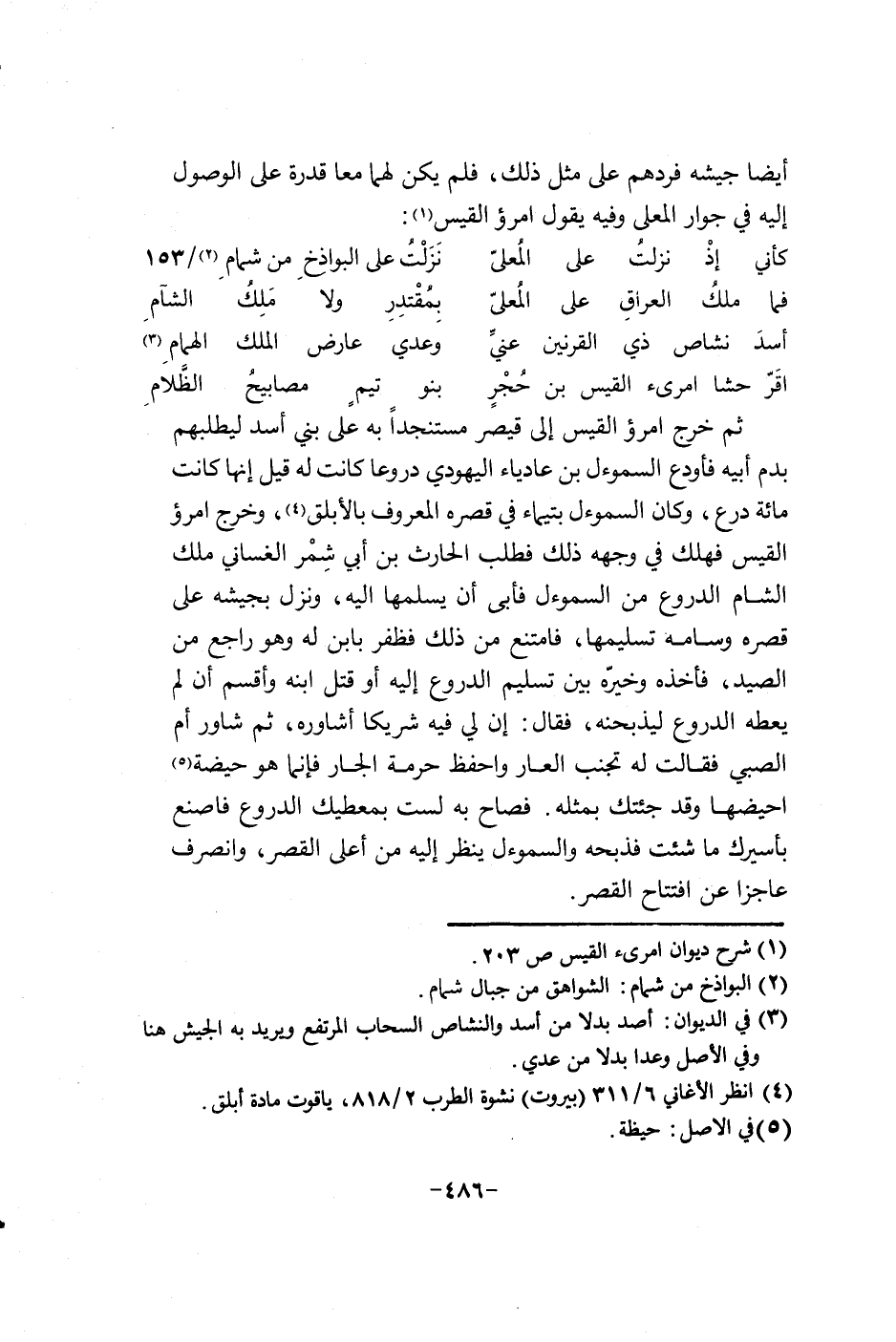 ثم خرج أمرؤ القيس آلنا قيصر مستنجداً به على بني أسد ليطلبهم بدم أبيه فأودع السموءل بن عادياء اليهودي دروعاً كانت له فيل إنها كانت مائة درع، وكان السموءل بتيماء في قصره المعروف بالأبق، وخرج أمرؤ القيس فهلك في وجهه ذلك فطلب الحارث بن أبي شمر الغساني ملك الشام الدروع من السموءل فأبى أن يسلمها إليه، ونزل بجيشه على قصره وسامه تسليمها، فأمتنع من ذلك فظفر بابن له وهو راجع من الصيد، فأخذه وخيره بين تسليم الدروع إليه أو قتل أبنه وأقسم إن لم يعطه الدروع ليذبحنه، فقال: إن لي فيه شريكاً أشاوره، ثم شاور أم الصبي فقالت له تجنب العار وأحفظ حرمة الجار فإنما هو حيضة أحيضها وقد جئتك بمثله. فصاح به لست بمعطيك الدروع فأصنع بأسيرك ما شئت فذبحه والسموءل ينظر إليه من أعلى القصر، وأنصرف عاجزاً عن افتتاح القصر.