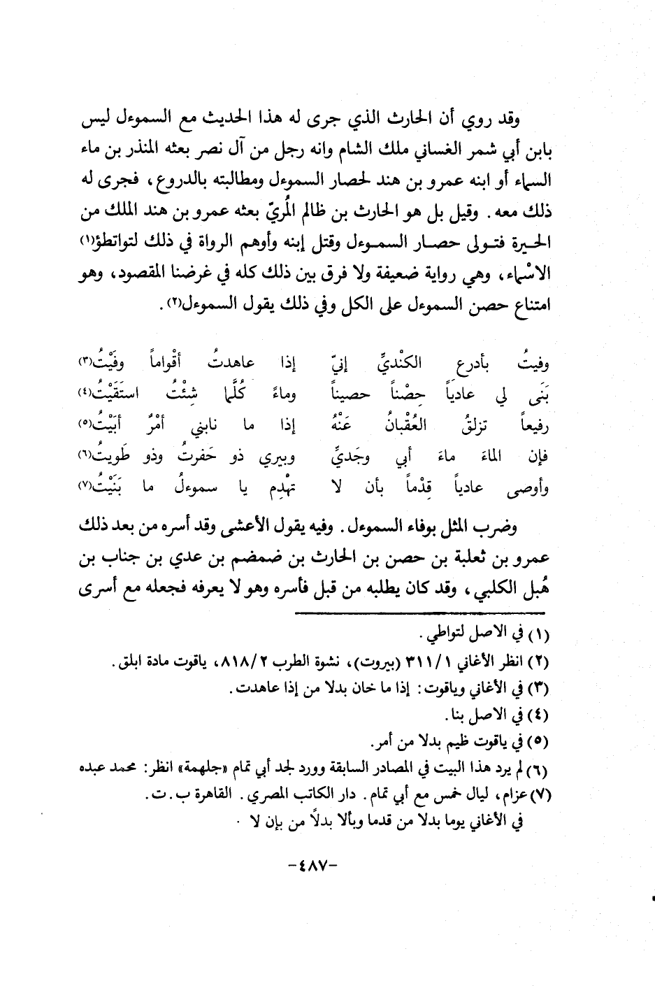 وضرب المثل بوفاء السموءل. وفيه يقول الأعشى وقد أسره من بعد ذلك عمرو بن ثعلبة بن حصن بن الحارث بن ضمضم بن عدي بن جناب بن هبل الكلبي، وقد كان يطلبه من قبل فأسره وهو لا يعرفه فجعله مع أسرى