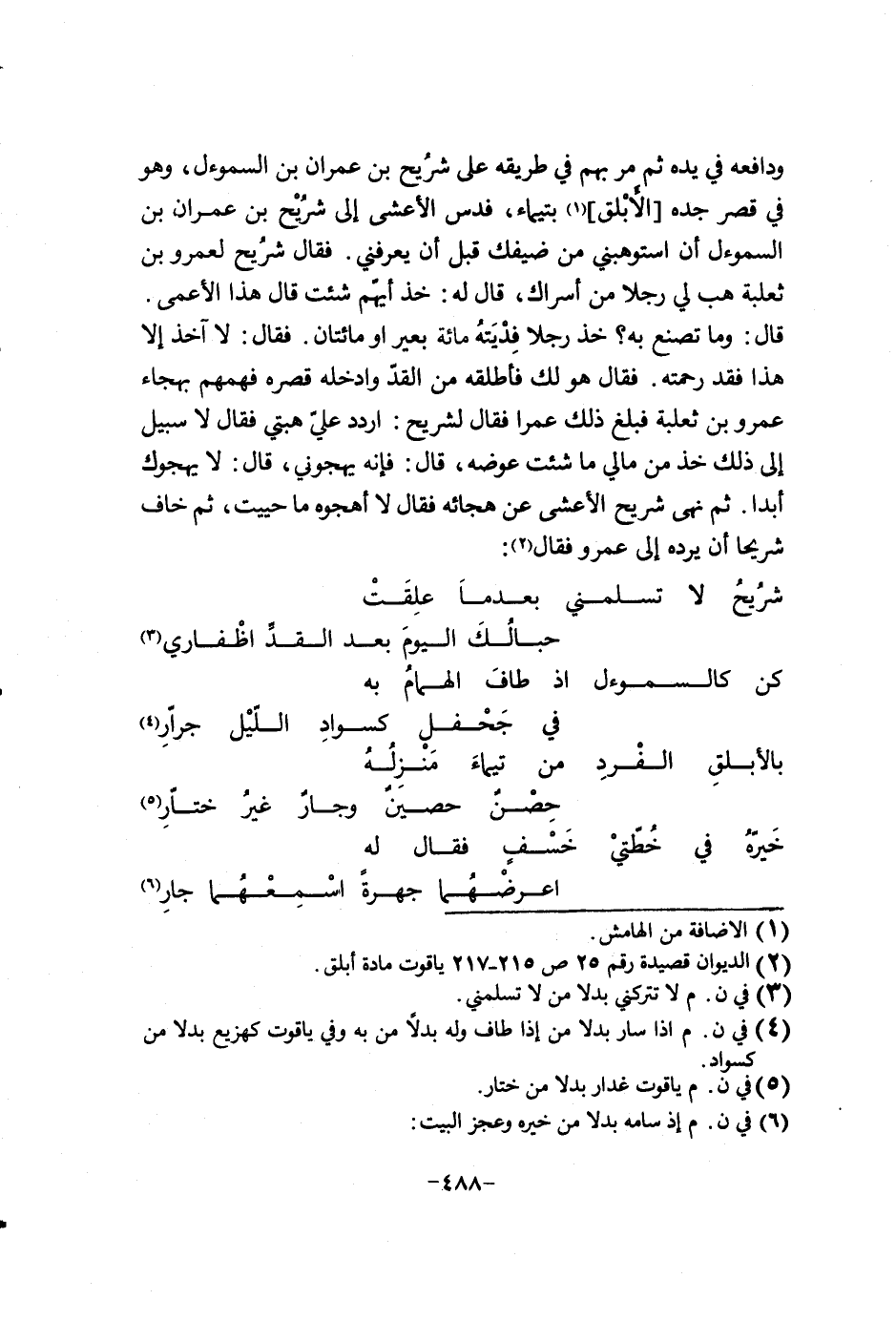 ودافعه في يده ثم مر بهم في طريقه على شريح بن عمران بن السموءل، وهو في قصر جده الأبلق بتيماء، فدس الأعشى إلى شريح بن عمران بن السموءل أن أستوهبني من ضيفك قبل أن يعرفني. فقال شريح لعمرو بن ثعلبة هب لي رجلاً من أسراك، قال له: خذ أيهم شئت قال هذا الأعمى. قال: وما تصنع به؟ خذ رجلاً فديته مائة بعير أو مائتان. فقال: لا آخذ أباح هذا فقد رحمته. فقال هو لك فأطلقه من القدّ وأدخله قصره فهمهم بهجاء عمرو بن ثعلبة فبلغ ذلك عمراً فقال لشريح: أردد عليّ هبتي فقال لا سبيل إلى ذلك خذ من مالي ما شئت عوضه، قال: فإنه يهجوني، قال: لا يهجوك أبداً. ثم نهى شريح الأعشى عن هجائه فقال لا أهجوه ما حييت، ثم خاف شريحاً أن يرده إلى عمرو فقال: