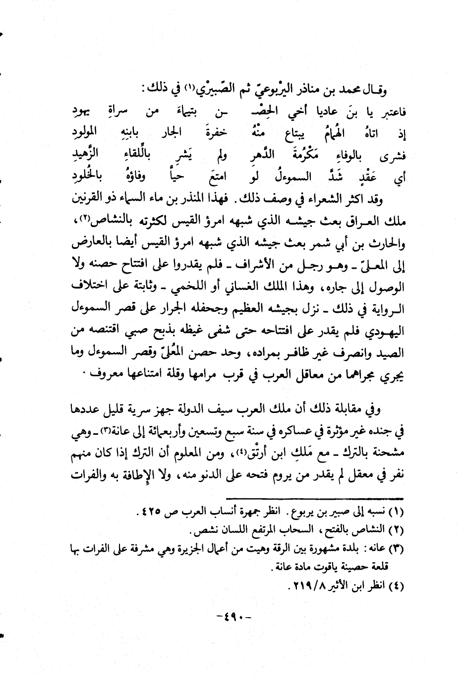 وقد أكثر الشعراء في وصف ذلك. فهذا المنذر بن ماء السماء ذو القرنيين ملك العراق بعث جيشه الذي شبهه أمرؤ القيس لكثرته بالنشاص، والحارث بن أبي شمر بعث جيشه الذي شبهه أمرؤ القيس أيضاً بالعارض آلنا المعلىّ - وهو رجل من الأشراف - فلم يقدروا على افتتاح حصنه ولا الوصول آلنا جاره، وهذا الملك الغساني أو اللخمي - وثابتة على اختلاف الرواية في ذلك - نزل بجيشه العظيم وجحفله الجرار على قصر السموءل اليهودي فلم يقدر على فتحه حتى شفى غيظه بذبح صبي أقتنصه من الصيد وأنصرف غير ظافر بمراده، وحد حصن المُعلىّ وقصر السموءل وما يجري مجراها من معاقل العرب في قرب مرامها وقله امتناعها معروف.