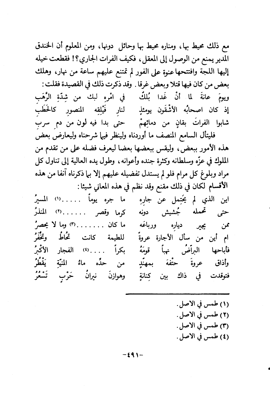 مع ذلك محيط بها، ومناره محيط بها وحائل دونها، ومن المعلوم أن الخندق المدير يمنع من الوصول إلى المعقل، فكيف الفرات الجاري؟! فقطعت خيله ألي اللجة وافتتحها عنوة على الفور لم تمنع عليهم ساعة من النهار، وهلك بعض من كان فيها قتلاً وبعض غرقاً. وقد ذكرت ذلك في القصيدة فقلت: