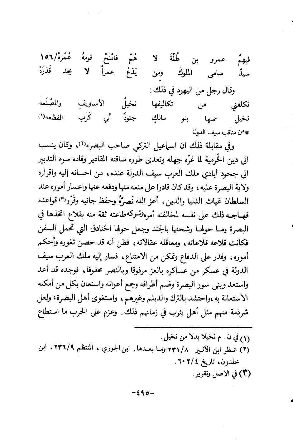 وفي مقابلة ذلك إن إسماعيل التركي صاحب البصرة، وكان ينسب آلنا دين الخرمية لما غرة جهله وتعدى طوره ساقته المقادير وقادة سوء التدبير آلنا جحود أيادي ملك العرب سيف الدولة عنده، من إحسانه إلينا وقراره ولاية البصرة علبه، وقد كان قادرا على منعه منها ودفعه عنها وأعسار أموره عند السلطان غياث الدنيا والدين، أعزه الله ونصره وحفظ جانبه وقرر قواعده فهاجه ذلك على نفسه لمخالفته أمره وتركه طاعته ثقة منه بقلاع أتخذها في البصرة وما حولها وشحنها بالجند وجعل حولها الخنادق التي تحمل السفن فكانت قلاعه وقلاعاته، ومعاقله وعقلاته، فظن إنه قد حصن ثغوره وأحكم أموره، وقدر على الدفاع وتمكن من الامتناع، فسار إلينا ملك العرب سيف الدولة في عسكر من عساكره بالعز مرفوقا وبالنصر محفوفا، فوجده قد أعد وأستعد وبنى سور البصرة وضم أطرافه وجمع أعوانه واستعان بكل من أمكنه الاستعانة به، وأحتشد به، وأحتشد بالترك والديلم وغيرهم، وأستغوى أهل البصرة، ولعل شرذمة منهم مثل أهل يثرب في زمانهم ذلك. وعزم على الحرب ما استطاع