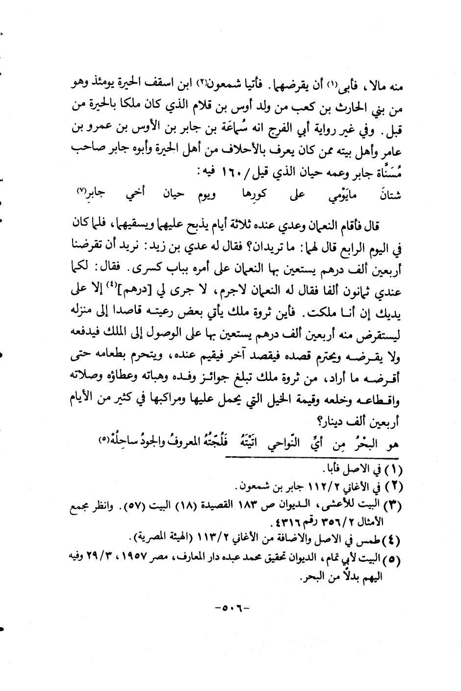 منه مالاً، فأبى أن يقرضهما. فأتيا شمعون أبن أسقف الحيرة يومئذ وهو من بني الحارث بن كعب من ولد أوس بن قلام الذي كان ملكاً بالحيرة من قبل. وفي غير رواية أبي الفرج إنه سملعة بن جابر الأوس بن عمرو بن عامر وأهل بيته ممن كان يعرف بالأحلاف من أهل الحيرة وأبو جابر صاحب مسناة جابر وعمه حيان الذي قيل160 فيه: