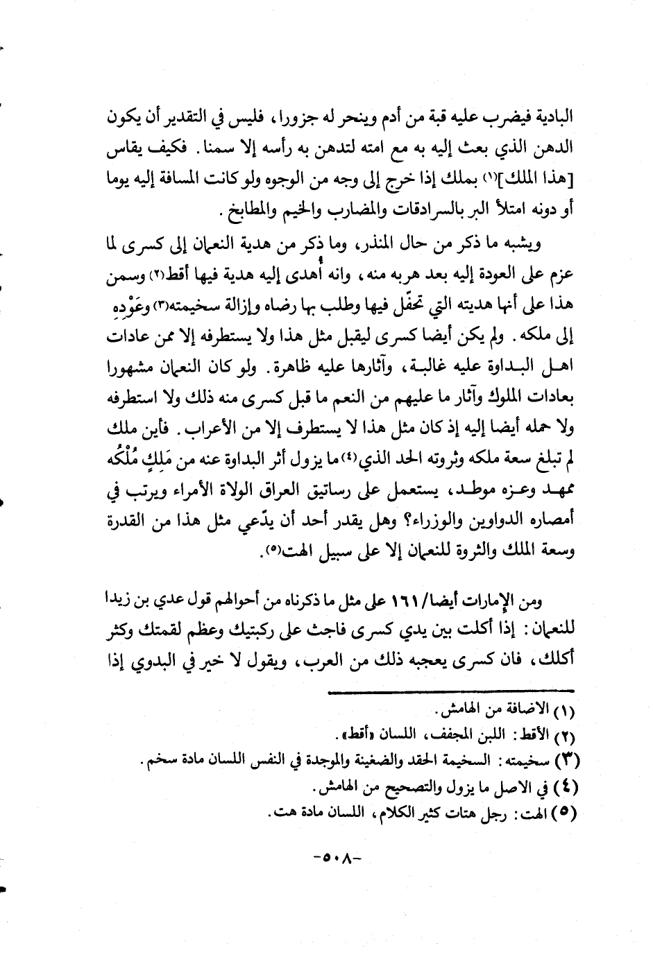 ويشبه ما ذكر من حال المنذر وما ذكر من هدية النعمان إلى كسرى لما عزم على العودة إليه بعد هربه منه، وإنه أهدى إليه هديه فيها أقط وسمن هذا على إنها هديته التي تحفل فيها وطلب بها رضاه وإزالة سخيمته وعوده الى ملكه. ولم يكن أيضاً كسرى ليقبل مثل هذا ولا يستطرفه إلى ممن عادات أهل البداوة عليه غالبةً، وآثارها عليه ظاهرة. ولو كان النعمان مشهوراً بعادات الملوك وآثار ما عليهم من النعم ما قبل كسرى منه ذلك ولا أستطرفه ولا حمله أيضاً إليه أكان مثل هذا لا يستطرف إلا من الأعراب. فاين ملك لم تبلغ سعة ملكه وثروته الحد الذي ما يزول أثر البداوة عنه من ملك ملكه ممهد وعزه موطد، يستعمل على رساتيق العراق الولاة الأمراء ويرتب في أمصاره الدواوين والوزراء؟ وهل يقدر أحد أن يدّعي مثل هذا من القدرة وسعة الملك والثروة للنعمان إلى على سبيل الهت.