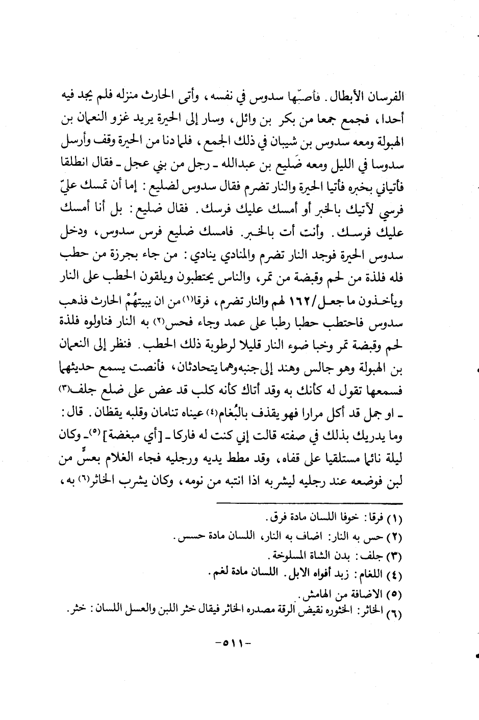 الفرسان الابطال. فاصبها سدوس في نفسه، وأتى الحارث منزله فلم يجد فيه أحداً، فجمع جمعاً من بكر بن وائل، وسار الى الحيرة يريد غزو النعمان بن الهبولة ومعه سدوس بن شيبان في ذلك الجمع، فلما دنى من الحيرة وقف وأرسل سدوساً في الليل ومعه ضليع بن عبد الله - رجل من بني عجل - فقال أنطلقا فأتياني بخبره فأتيا الحيرة والنار تضرم فقال سدوس لضليع: أما إن تمسك عليّ فرسي لآتيك بالخبر أو أمسك عليك فرسك. فقال ضليع: بل أنا أمسك عليك فرسك. وأنت آت بالخبر. فامسك ضليع فرس سدوس، ودخل سدوس الحيرة فوجد النار تضرم والمنادي ينادي: من جاء بجزرة من حطب فله فلذة من لحم وقبضة من تمر، والناس يحتطبون ويلقون الحطب على النار ويأخذون ما جعل162 لهم والنار تضرم، فرقاً من أن يبيتهم الحارث فذهب سدوس فاحتطب حطباً رطباً على عمد وجاء فحس به النار فناوله فلذة من لحم وقبضة تمر وخبا ضوء النار قليلاً لرطوبة ذلك الحطب. فنظر الى النعمان بن الهبولة وهو جالس وهند الى جنبه وهما يتحادثان، فانصت يسمع حديثهما فسمعها تقول له كانك به وقد أتاك كانه كلب قد عض على ضلع جلف - او جمل قد أكل مراراً فهو يقذف بالبغام عيناه تنامان وقلبه يقظان. قال: وما يدريك بذلك في صفته قالت أني كنت له فاركاً - أي مبغضةً - وكان ليلة نائماً مستلقياً على قفاه، وقد مطط يديه ورجليه فجاء الغلام بعسَّ من لبن فوضعه عند رجليه ليشربه إذا أنتبه من نومه، وكان يشرب الخاثر به،