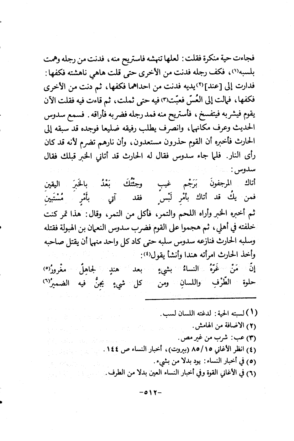 فجاءت حية منكرة فقلت: لعلها تنهشه فاستريح منه، فدنت من رجله وهمت بلسبه، فكف رجله فدنت من الاخرى حتى قلت ها هي ناهشته فكفها: فدارت الى عند يديه فدنت من أحداهما فكفها، ثم دنت من الاخرى فكفها، فمالت الى العسَّ فعبّت فيه حتى ثملت، ثم قاءت فيه فقلت الان يقوم فيشربه فيتفسخ، فاستريح منه فمد رجله فضربه فأراقه. فسمع سدوس الحديث وعرف مكانهما، وانصرف يطلب رفيقه ضليعاً فوجده قد سبقه الى الحارث فاخبره إن القوم حذرون مستعدون، وإن نارهم تضرم لانه قد كان رأى النار. فلما جاء سدوس فقال له الحارث قد أتاني الخبر قبلك فقال سدوس: