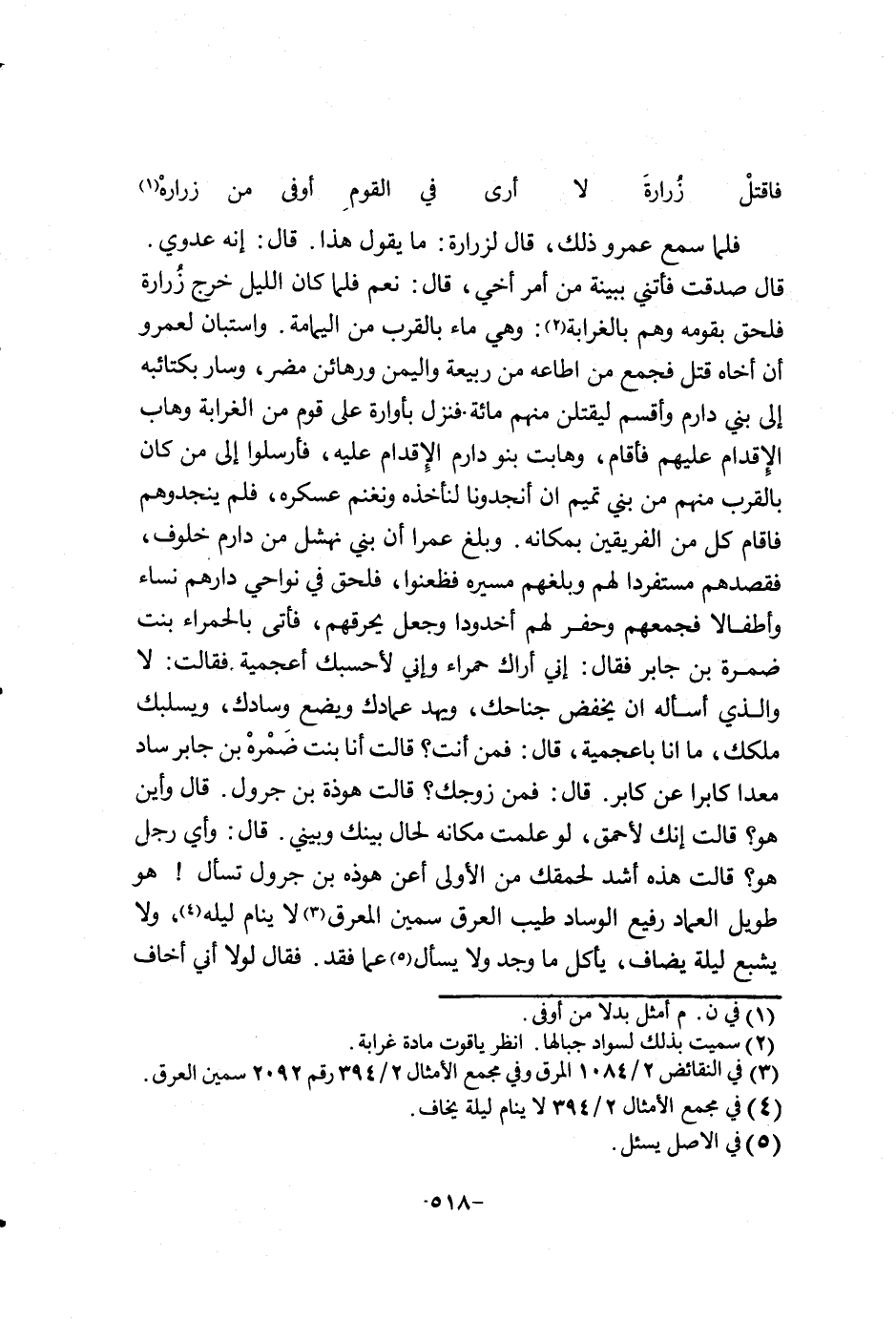 فلما سمع عمرو ذلك، قال لزرارة: ما يقول هذا، قال: إنه عدوي. قال صدقت فأتني ببينة من أمر أخي، قال: نعم فلما كان الليل خرج زرارة فلحق بقومه وهم بالغرابة: وهي ماء بالقرب من اليمامة. وإستبان لعمر أن أخاه قتل فجمع من أطاعه من ربيعة واليمن ورهائن مضر، وسار بكتائبه إلى بني دارم وأقسم ليقتلن منهم مائة. فنزل بأوارة على قوم من الغرابة وهاب الإقدام عليهم فأقام، وهابت بنو دارم الإقدام عليه، فأرسلوا إلى من كان بالقرب منهم من بني تميم أن أنجدونا لنأخذه ونغنم عسكره، فلم ينجدوهم فأقام كل من الفريقين بمكانه. وبلغ عمراً أن بني نهشل من دارم خلوف، فقصدهم مستفرداً لهم وبلغهم مسيره فظعنوا، فلحق في نواحي دارهم نساء وأطفالاً فجمعهم وحفر لهم إخدوداً وجعل يحرقهم، فأتى بالحمراء بنت ضمرة بن جابر فقال: إني أراك حمراء وإني لأحسبك أعجمية فقالت: لا والذي أسأله أن يخفض جناحك، ويهد عمادك ويضع وسادك، ويسلبك ملكك، ما أنا بأعجمية، قال: فمن أنت؟ قالت أنا بنت ضمرة بن جابر ساد معداً كابراً عن كابر. قال: فمن زوجك؟ قالت هوذة بن جرول. قال وأين هو؟ قالت أنك لأحمق، لو علمت مكانه لحال بينك وبيني. قال: وأي رجل هو؟ قالت هذه أشد لحمقك من الأولى أعن هوذة بن جرول تسأل! هو طويل العماد رفيع الوساد طيب العرق سمين المعرق لا ينام ليله، ولا يشبع ليلة يضاف، يأكل ما وجد ولا يسأل عما فقد. فقال لولا إني أخاف