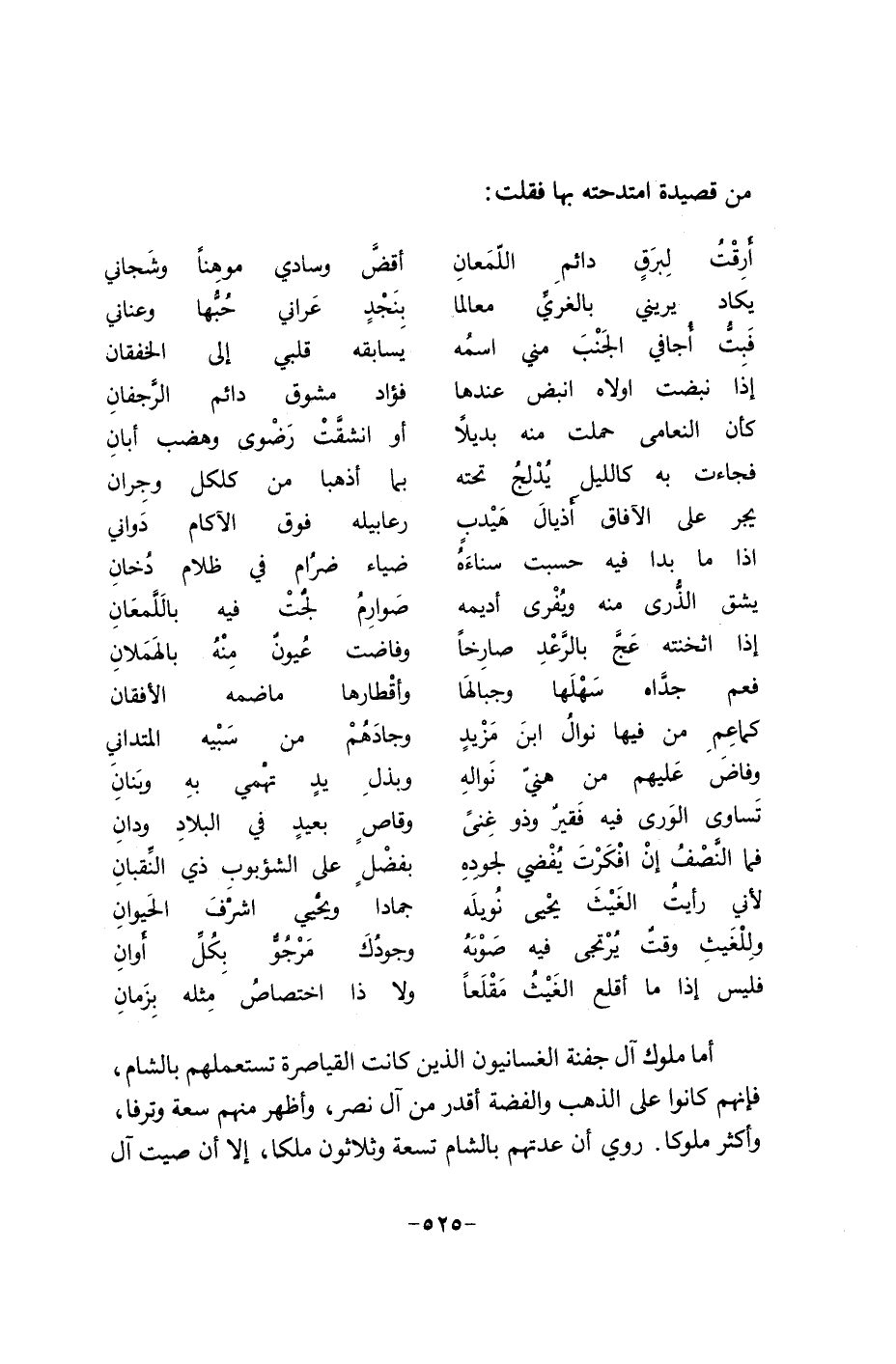 اما ملوك آل جفنه الغسانيون الذين كانت القياصرة تستعملهم بالشام، فانهم كانوا على الذهب والفضة أقدر من آل نصر، وأظهر منهم سعه وترفا، وأكثر ملوكا. روي إن عدتهم بالشام تسعة وثلاثون ملكاً، الا إن صيت آل