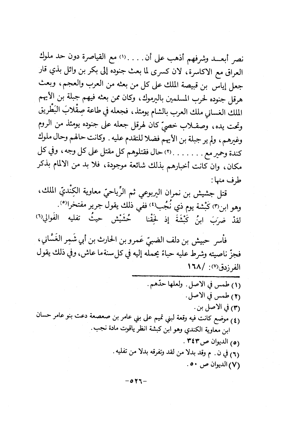 نصر أبعد وشرفهم أذهب على أن0000 مع القياصرة دون حد ملوك العراق مع الاكاسرة، لان كسرى لما بعث جنوده الى بكر بن وائل بذي قار جعل إياس بن قبيصة الملك على من بعثه من العرب والعجم، وبعث هرقل جنوده لحرب المسلمين باليرموك، وكان ممن بعثه فيهم جبلة بن الايهم الملك الغساني ملك العرب بالشام يومئذ، فجعله في طاعة صقلاب البطريق وتحت يده، وصقلاب خصي كان هرقل جعله على جنوده يومئذ من الروم وغيرهم، ولم ير جبلة بن الايهم فضلا للتقدم عليه. وكانت حالهم وحال ملوك كندة وحمير مع0000000000حال فقتلوهم كل مقتل على وجه، وفي كل مكان، وإن كانت أخبارهم بذلك شائعة موجودة، فلا بد من الالمام بذكر طرفها منها: قتل جشيش بن نمران اليربوعي ثم الرياحي معاوية لكندي الملك، وهو أبن كبشة يوم ذي نجب ففي ذلك يقول جرير مفتخرا.
